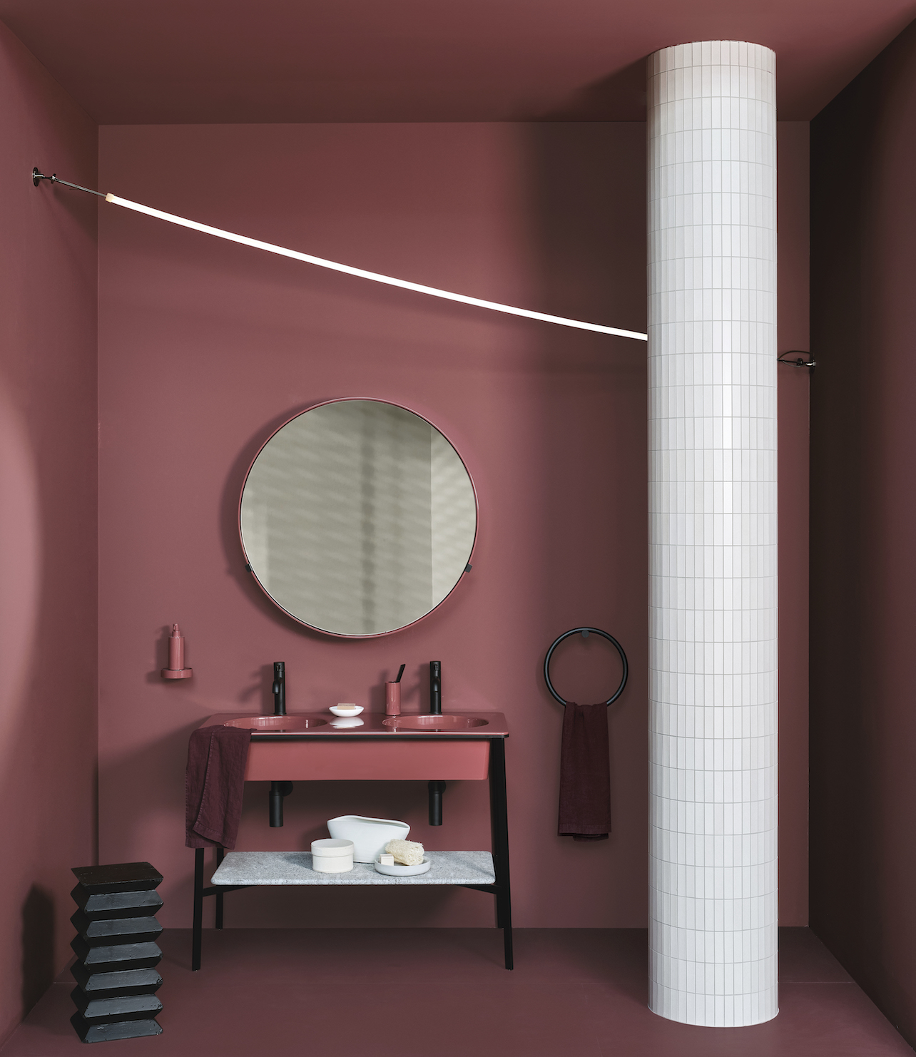 Nell’immagine, Catino Doppio di Ceramica Cielo composto da lavabo in ceramica nella finitura Corallo delle “Acque di Cielo”, struttura Nero Matt e piano in pietra Azul Noche. Completano l’ambiente l’elegante Specchio contenitore Round Box con scocca laccata Corallo, il portasciugamani ad anello finitura Nero Matt e la mensola tonda con dispenser e bicchiere Corallo. Tutti i prodotti sono disegnati da Andrea Parisio e Giuseppe Pezzano
