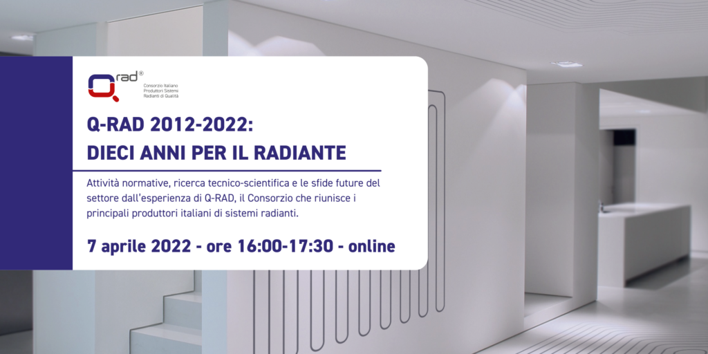 La climatizzazione radiante è un settore in continuo cambiamento. Una tecnologia in costante evoluzione che il Consorzio Q-RAD ha accompagnato in questi ultimi dieci anni proponendo nuove normative per il comparto e partecipando ai gruppi di lavoro internazionali per la definizione dei regolamenti. In occasione dei dieci anni del Consorzio, Q-RAD organizza un webinar in streaming sia per ripercorrere alcune tappe fondamentali del percorso di sviluppo del Consorzio che per offrire uno sguardo pionieristico sul futuro di questa tecnologia di riscaldamento e raffrescamento.
