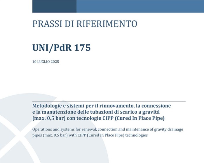 È ora disponibile sul Catalogo la Prassi di Riferimento UNI/PdR 175 “Metodologie e sistemi per il rinnovamento, la connessione e la manutenzione delle tubazioni di scarico a gravità (max. 0,5 bar) con tecnologie CIPP (Cured In Place Pipe)”.
