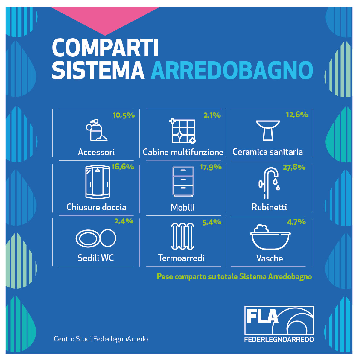 Il comparto dei mobili bagno – che rappresenta il 17,9 % sul totale del sistema – nel 2021 valeva 683 milioni di euro, il 67% dei quali realizzati attraverso vendite sul mercato nazionale (quota in aumento rispetto all’anno precedente), mentre un terzo è relativo all’export. La variazione del fatturato è del +25% rispetto al 2020, in particolare grazie alle maggiori vendite in Italia (+32,4%). Positive anche le esportazioni (+12,2%).