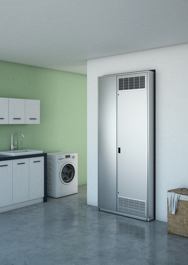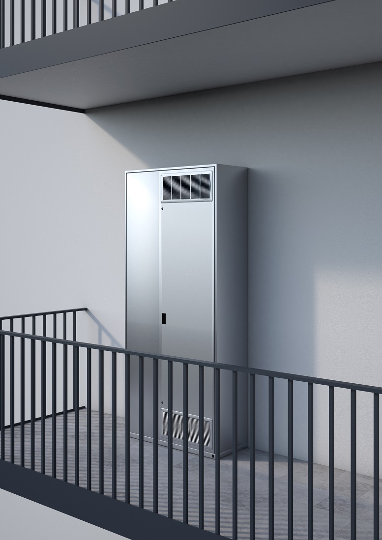 Elemento-chiave del sistema è un armadio tecnico auto-portante in acciaio zincato (o con verniciatura a polvere RAL 9016) progettato per consentire un’elevata flessibilità d’installazione: ad appoggio o a semi-incasso, all’interno così come all’esterno dell’edificio, seppur in zona protetta dalle intemperie. Nell’armadio trovano spazio: