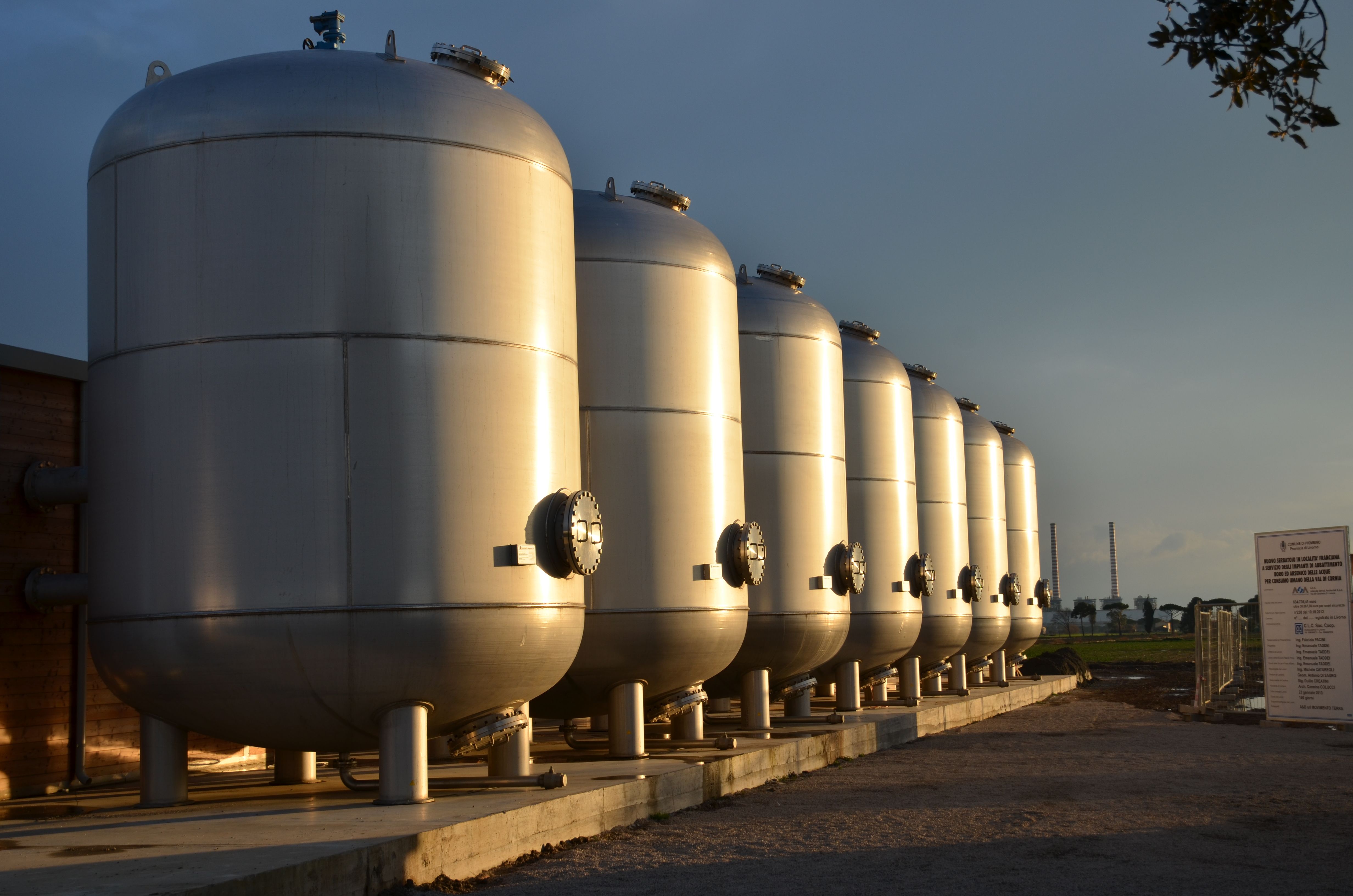 Le unità di filtrazione sono costituite da serbatoi costruiti secondo le specifiche tecniche determinate in attuazione delle seguenti norme: Direttiva PED – Direttiva 97/23/CE – certificazione di attrezzature a pressione ed insiemi immessi sul mercato comunitario europeo e Decreto Legislativo 25.02.2000 n. 93 – Attuazione della direttiva 92/23/CE in materia di attrezzatura in pressione. I sette filtri sono costituti in acciaio inox AISI 316L adatto per serbatoi in pressione, sono dotati di 3 passi d’uomo ø 500 mm, uno superiore, intermedio e uno inferiore, per permettere l’ingresso nel filtro, anche già caricato, per l’ispezione dell’interno, delle tubazioni di distribuzione e degli ugelli.