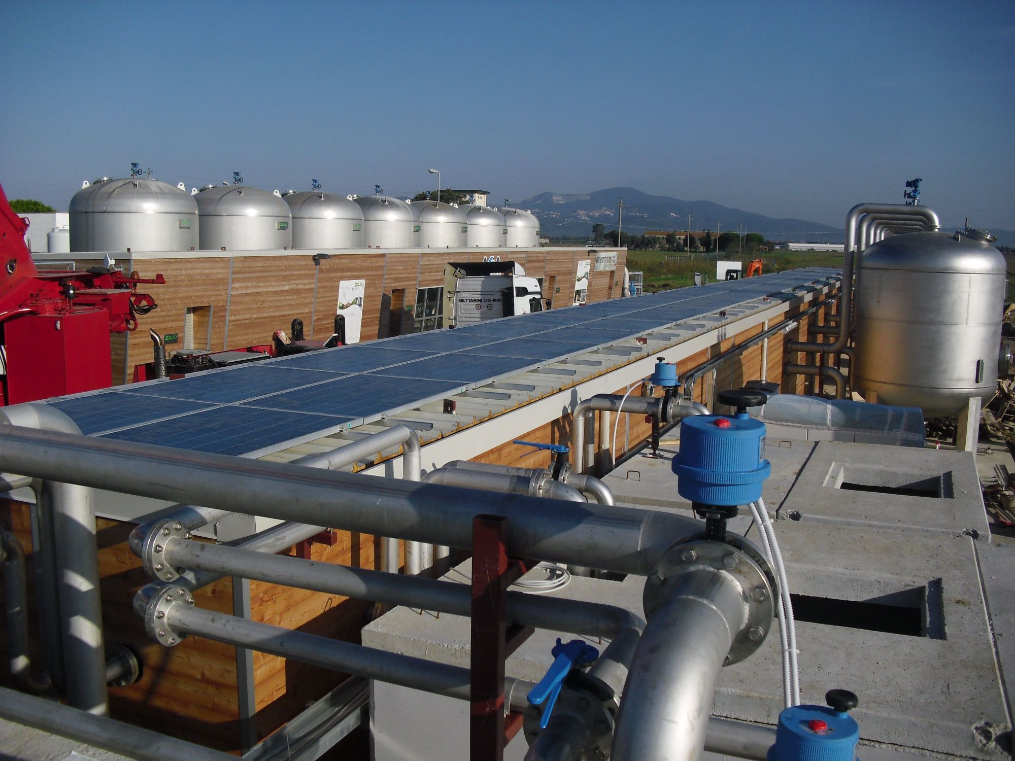 L’impianto fotovoltaico è stato progettato considerando gli ingombri complessivi della platea di contenimento e i consumi energetici e, nel futuro, rivestirà un ruolo sempre più strategico per l’esercizio della centrale. Sul tetto sono stati installati 264 moduli fotovoltaici per 97.000 kWh annui prodotti che garantiscono la copertura del 75% del fabbisogno.