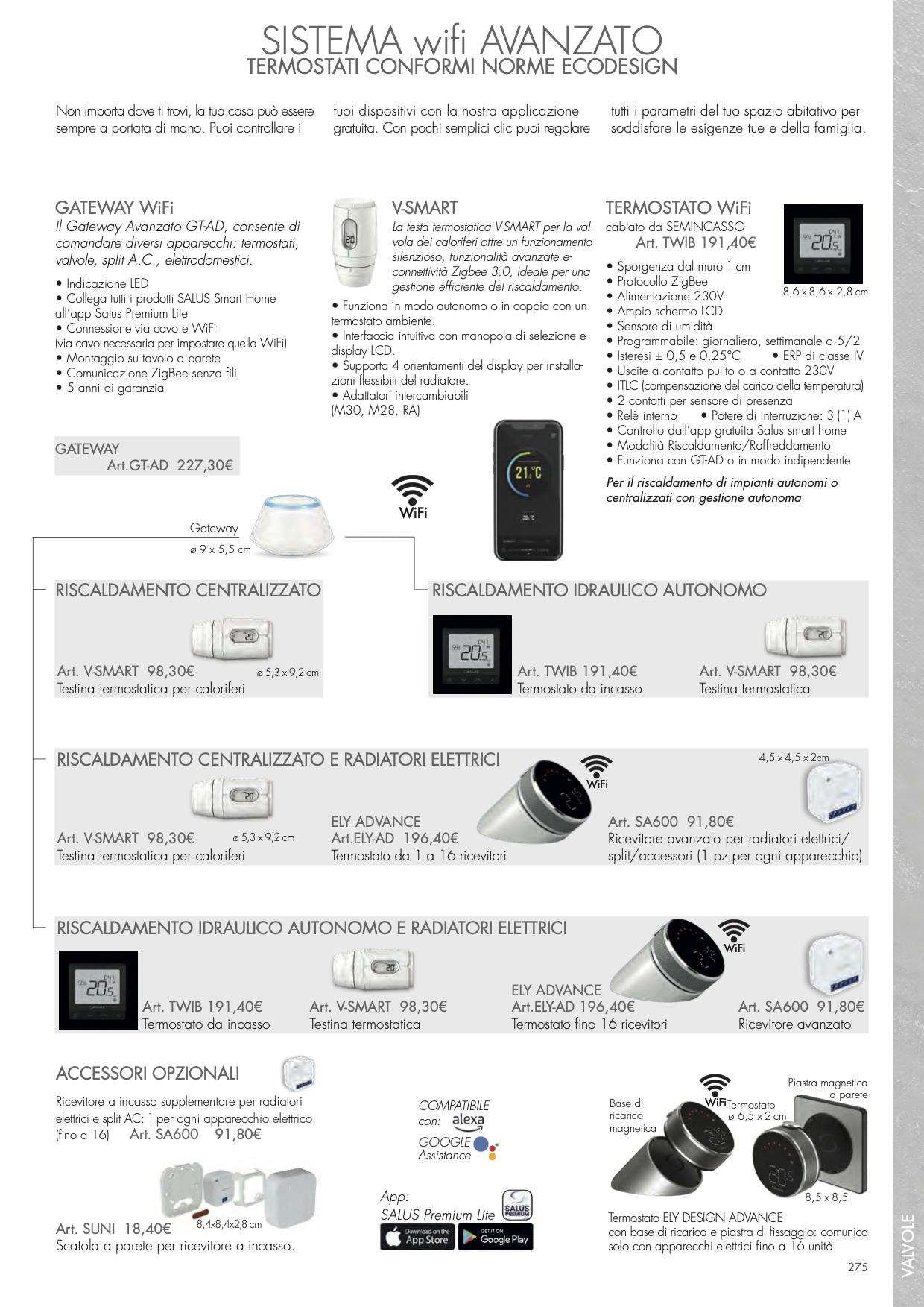 - Il sistema WiFi avanzato con Gateway GT-AD, compatibile con Google Assistance e Alexa, insieme con un termostato WiFi cablato a incasso, la testa termostatica V-Smart ed il termostato Ely Design Advance , in grado di gestire singolarmente fino a 16 apparecchi.