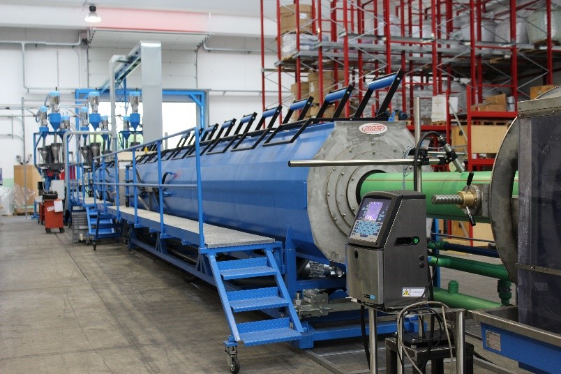 «Stiamo completando i collaudi in questi giorni – afferma Lino Petenà presidente di Aquatechnik – per essere operativi dal mese di Agosto» la nuova linea consente di produrre tubazioni fino a 630 mm di diametro esterno, che possono essere realizzate con la tecnologia tre strati, ovvero tubazioni realizzate con tre differenti materiali, uno strato interno in PP-RCT evoluzione del PP-R che incrementa le prestazioni delle tubazioni per resistenza agli agenti ossidanti e alle alte temperature; strato intermedio di PP-R caricato con speciali fibre per ridurre le dilatazioni termiche ed incrementare le resistenze meccaniche della struttura del tubo, e uno strato esterno in PPR super80 che garantisce una maggior resistenza agli urti.
