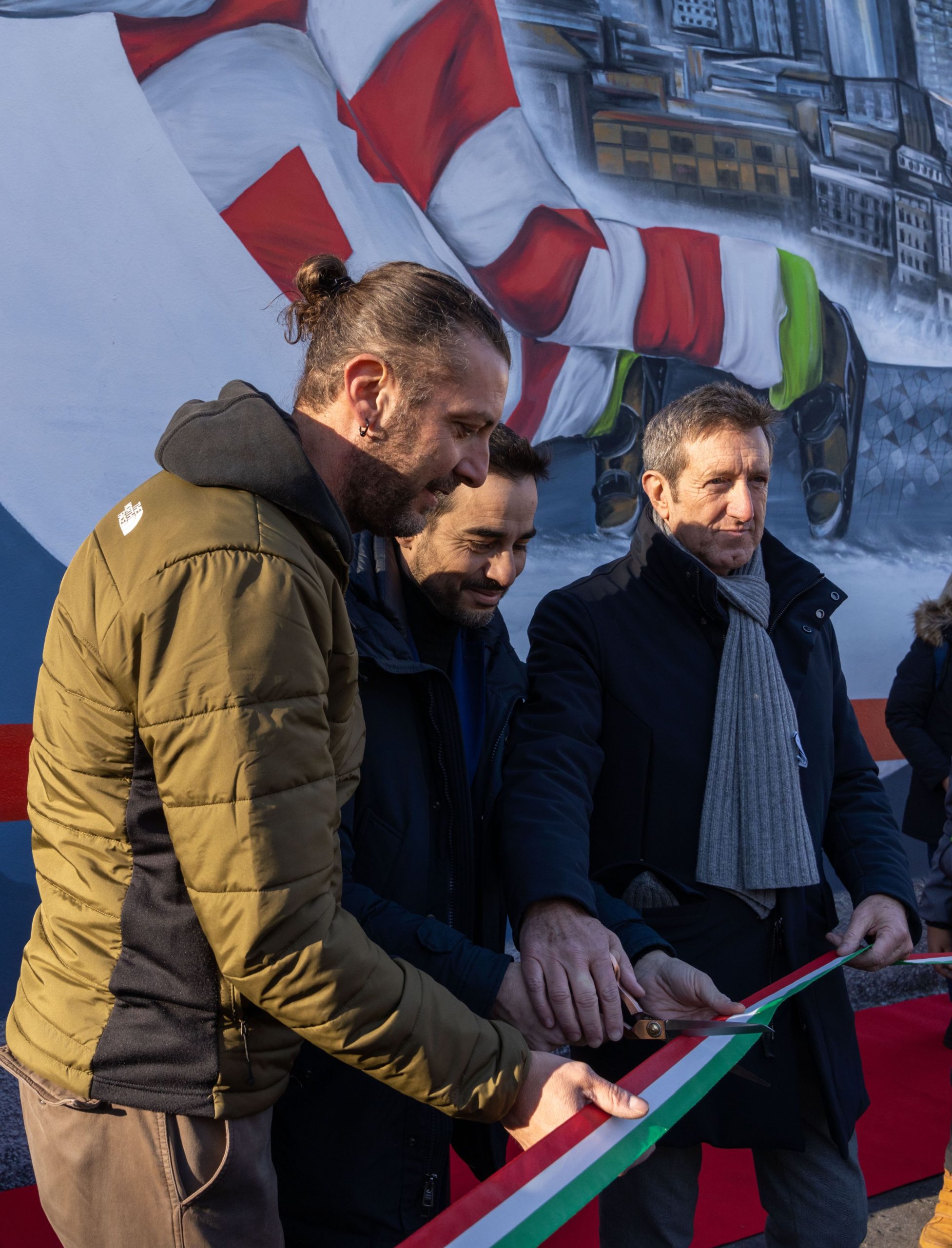 Il taglio del nastro con il writer ACME107, Santo Minniti Presidente del Municipio 6 di Milano, e Fabrizio Maja Vice President di Mitsubishi Electric