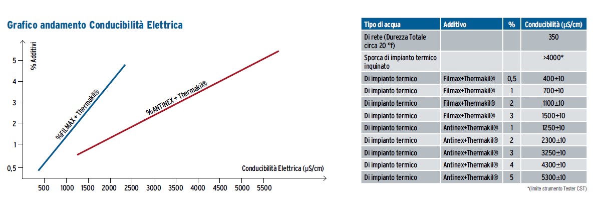 4 VERIFICARE durante il trattamento defangante il valore della conducibilità elettrica con apposito conducimetro TESTER CST (foto 4), essa dovrà attestarsi entro i valori previsti (riferimenti in tabella). Ciò servirà a determinare con buona approssimazione tramite apposito calcolo il volume dell’impianto e a verificare la giusta concentrazione di additivo ANTINEX inserito nel circuito