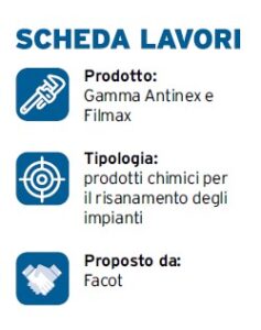 Facot Chemicals, da oltre 60 anni attenta alle esigenze del mercato cui si rivolge, presenta a tal proposito un’intera gamma di nuovi articoli tecnici e professionali dedicati al T.EM.I.T. Trattamento e Manutenzione degli Impianti Termici. Quest’ultimi sono mirati a risolvere con grande efficacia alcune problematiche di funzionamento che spesso sfuggono al controllo, se sottovalutate, e obbligano a intervenire a posteriori quando i cali di rendimento determinano costi di gestione molto importanti.