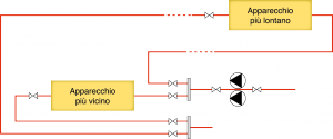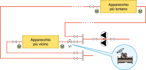 1. Dimensionare le tubazioni di collegamento dell’apparecchio allacciato con le tubazioni di maggior lunghezza modo che esse abbiano le stesse perdite di carico di quelle dell’apparecchio collegato con le tubazioni di minor lunghezza. Si tratta della soluzione più ovvia, ma che richiede calcoli accurati e non sempre può dare i risultati desiderati perché i diametri delle tubazioni disponibili variano a “scalini” e perciò la realizzazione di un bilanciamento ottimale e quindi l’equalizzazione delle portate d’acqua sono quasi sempre un’utopia.