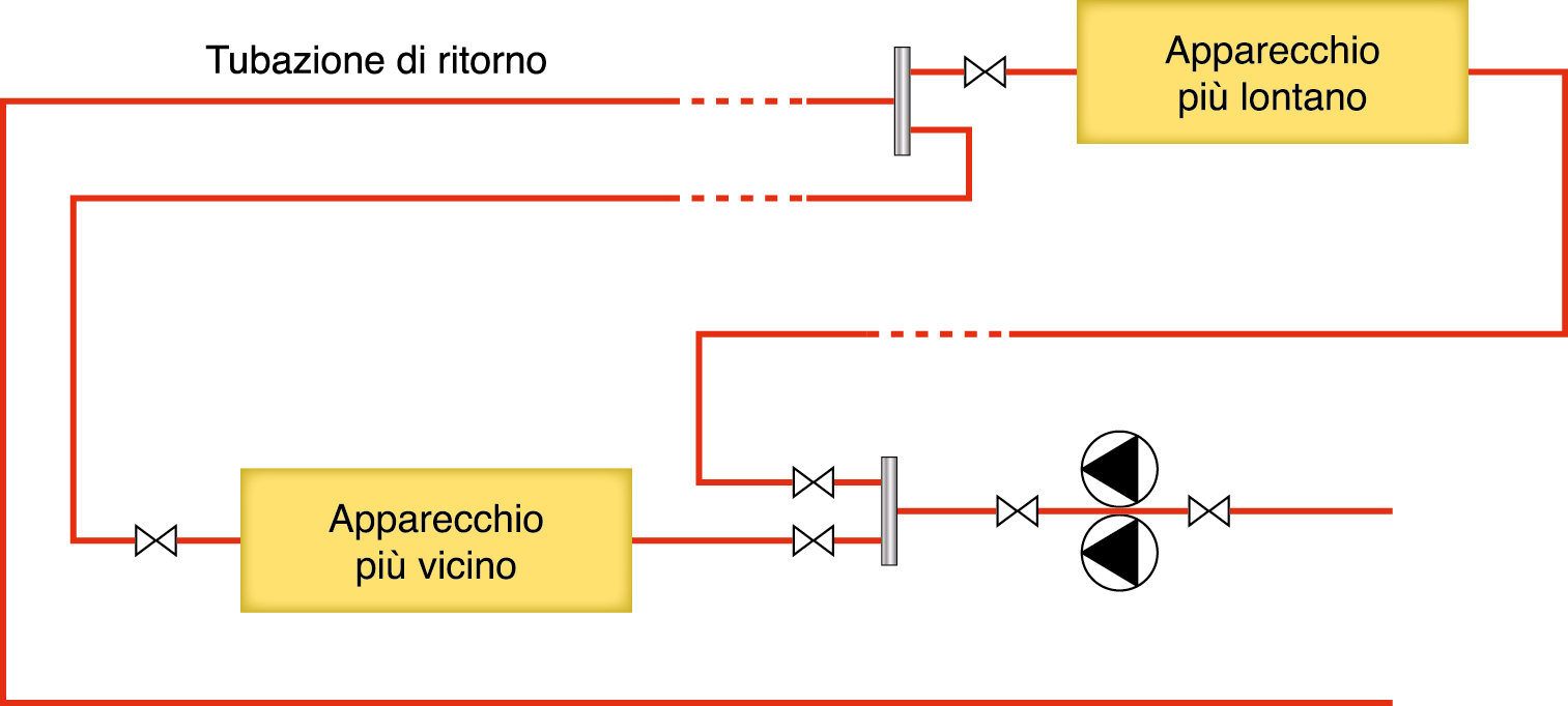 1. Dimensionare le tubazioni di collegamento dell’apparecchio allacciato con le tubazioni di maggior lunghezza modo che esse abbiano le stesse perdite di carico di quelle dell’apparecchio collegato con le tubazioni di minor lunghezza. Si tratta della soluzione più ovvia, ma che richiede calcoli accurati e non sempre può dare i risultati desiderati perché i diametri delle tubazioni disponibili variano a “scalini” e perciò la realizzazione di un bilanciamento ottimale e quindi l’equalizzazione delle portate d’acqua sono quasi sempre un’utopia.