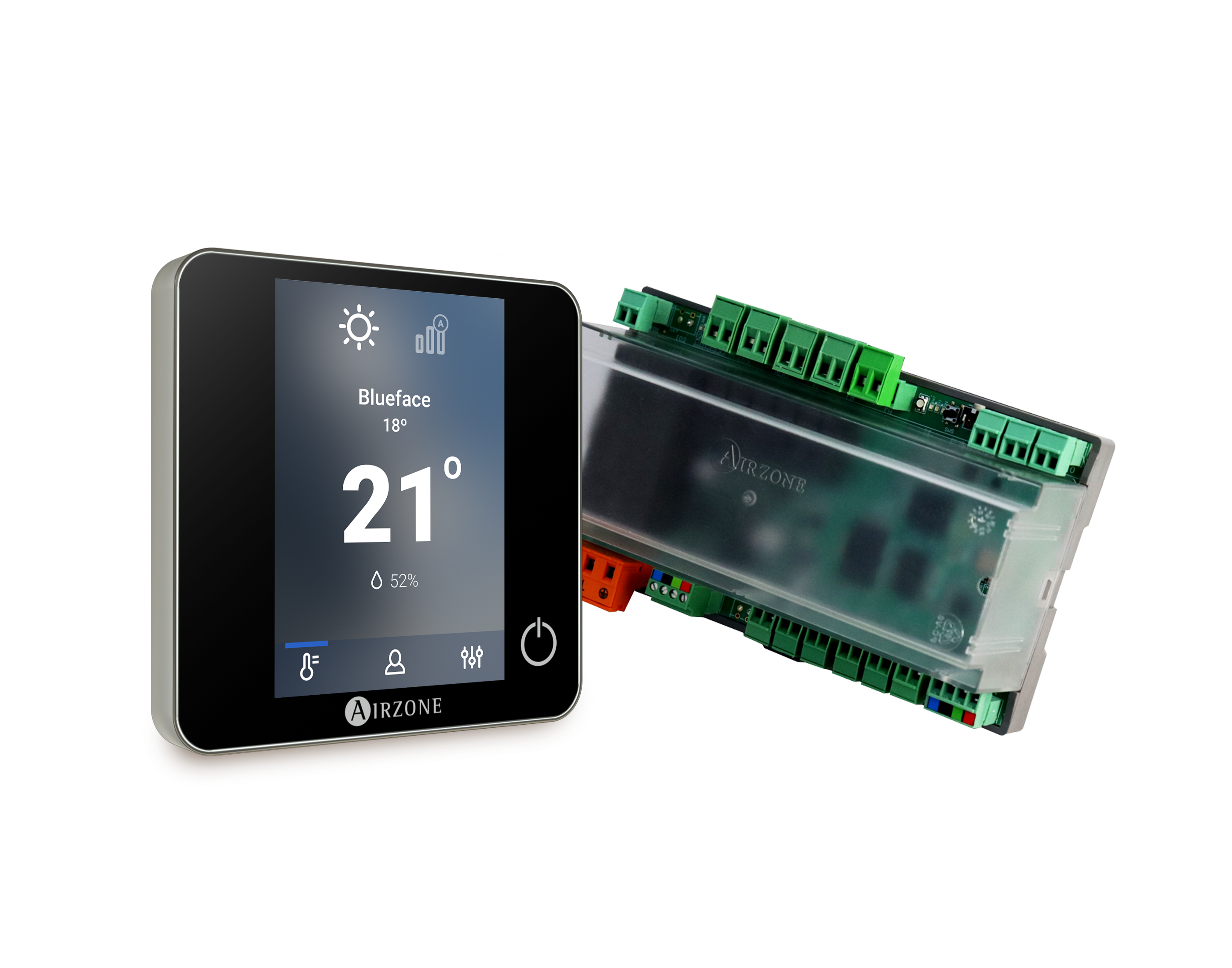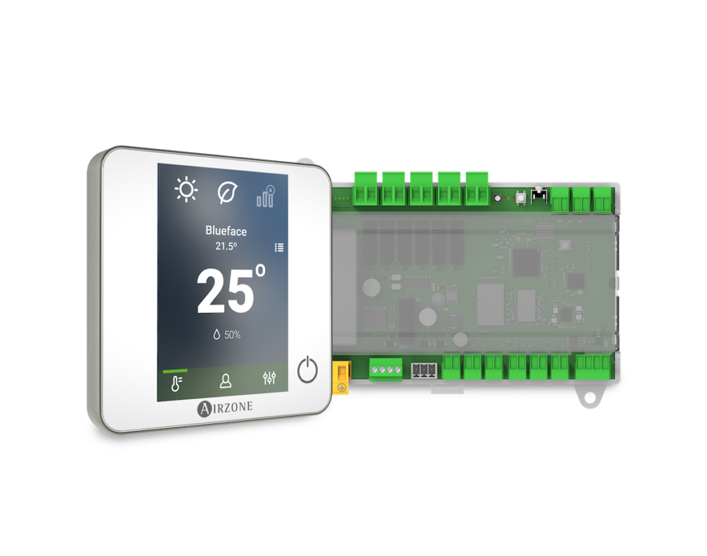 Il prodotto viene installato contemporaneamente a un termostato touch Blueface, dal quale si può anche controllare l’impianto, che consente di accendere e spegnere la macchina, cambiare la temperatura impostata, cambiare la velocità del ventilatore, accedere alle impostazioni dell’utente quali cambio della lingua o delle preferenze di luminosità dello schermo, e cambio della modalità (caldo o freddo).