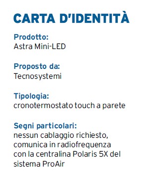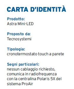 Tecnosystemi presenta il nuovo termostato touch a parete Astra Mini-LED, progettato per offrire un controllo preciso della temperatura all’interno dell’ambiente di utilizzo. Il termostato opera in sinergia con la centralina Polaris 5X del sistema ProAir, in grado di supportare a sua volta fino a 16 cronotermostati.