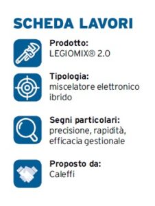 I miscelatori elettronici ibri­di LEGIOMIX® 2.0 di Calef­fi coniugano la precisione e la rapidità dei sistemi meccani­ci termostatici all’efficacia ge­stionale e funzionalità dei pro­dotti elettronici. Si installano in impianti di strutture ad utilizzo collettivo dove è obbligatorio il controllo e la prevenzione della Legionellosi in modo program­mato: grandi condomini, ospe­dali, case di cura, centri sporti­vi e commerciali, alberghi, cam­peggi e collegi.