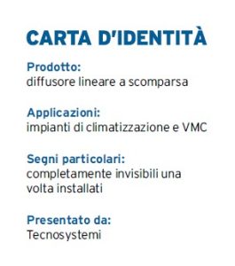 Tecnosystemi presenta il diffusore lineare a scomparsa a singola feritoia con deflettore e serranda, completo di plenum coibentato, adatto per la mandata e la ripresa dell’aria negli impianti di condizionamento e ventilazione meccanica controllata.