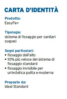 EasyFix+ è il nuovo sistema di fissaggio nascosto proposto da Ideal Standard per le nuove serie di Sanitari sospesi i.life B & S. Si tratta di una soluzione veloce, facile e sicura che consente agli installatori di ridurre di circa il 10% i tempi di posa in opera dei wc rispetto al sistema di fissaggio standard.