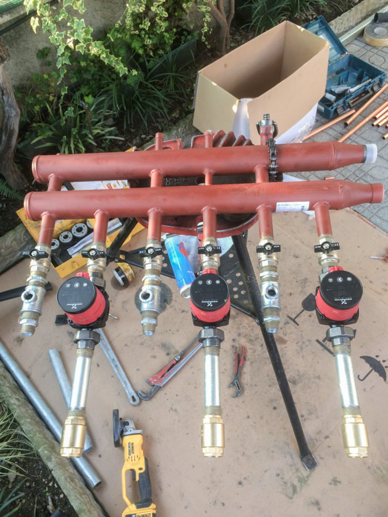 Le foto illustrano un K18 Hybrigas installato presso una villa monofamiliare che si estende su tre livelli. La posa è avvenuta dopo il lavaggio dell’impianto e il posizionamento al suo ingresso alla pompa di calore di un filtro defangatore. Subito dopo, la pompa di calore è stata collegata al gas metano e ai tubi di mandata e del riscaldamento, che percorrono alcuni metri ed entrano in un locale tecnico; qui sono presenti un collettore idraulico con tre zone – una per livello – e altrettanti termostati che controllano la temperatura degli ambienti riscaldati.