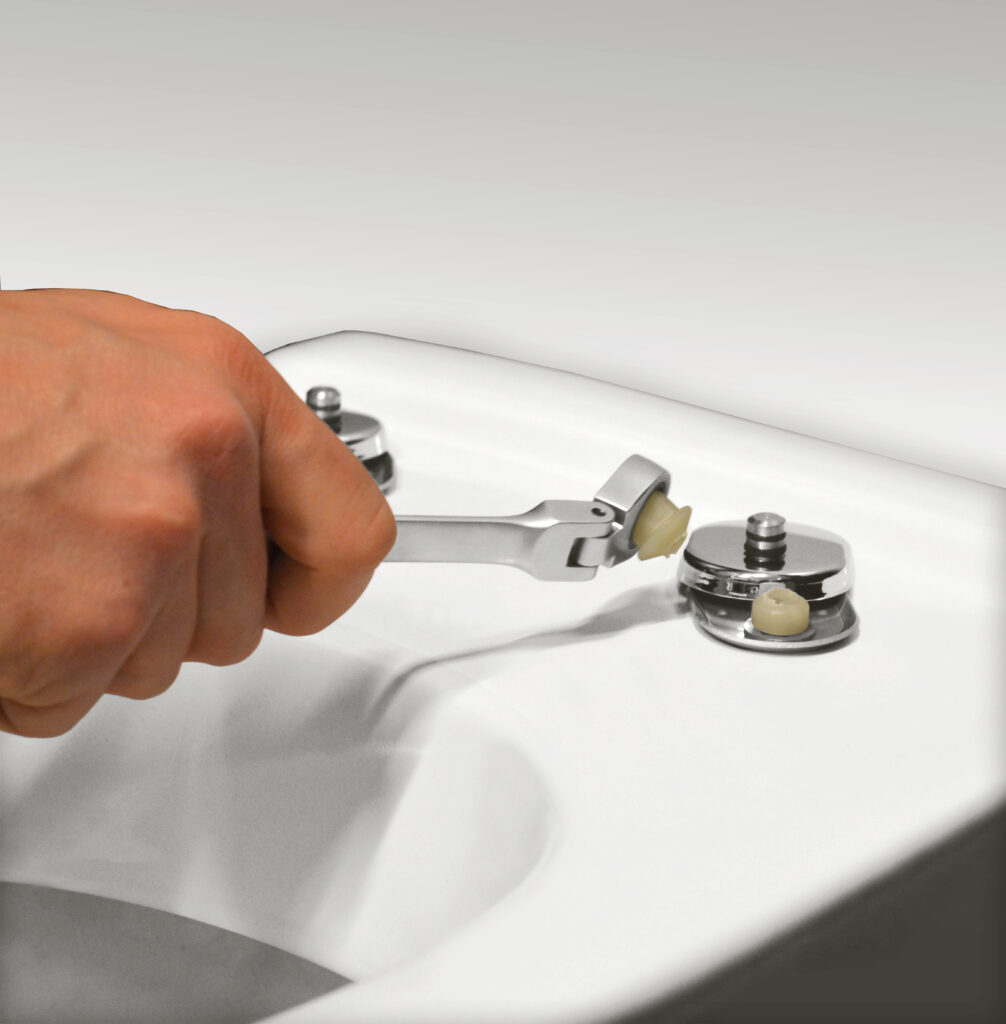 STA-TITE è facile da installare, veloce e non si allenta mai, evitando che il sedile non slitti, non vacilli e non si sposti sul vaso. Un dado a pezzo unico integrato elimina ogni difficoltà durante l’installazione in quanto la parte inferiore si spezza quando la torsione ottimale viene raggiunta. Inoltre il sistema di fissaggio raggiunge la sicurezza per mezzo di una piccola boccola “alettata” disposta sul bullone in modo che il sedile si adatti sempre perfettamente all’interno dei fori di montaggio nel vaso. Infine, STA-TITE è adatto sia per vasi che richiedono l’installazione del sedile copriwater dal basso sia per quelli che richiedono l’installazione dall’alto.