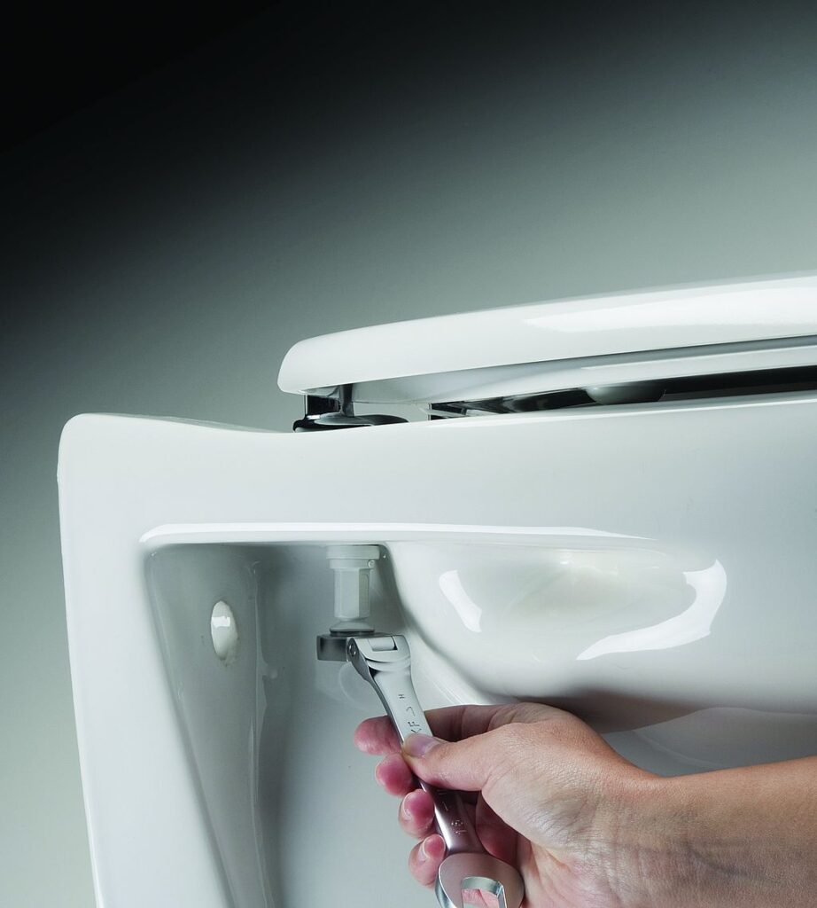 TECNOLOGIA. Con il sistema Push n’Clean basta spingere il sedile verso il basso per sbloccare e staccare il sedile, consentendo così una comoda pulizia. Push n’Clean è disponibile con cerniere in acciaio inossidabile a chiusura rallentata e il nuovo sistema di fissaggio STA-TITE®, che garantisce un sedile stabile.
