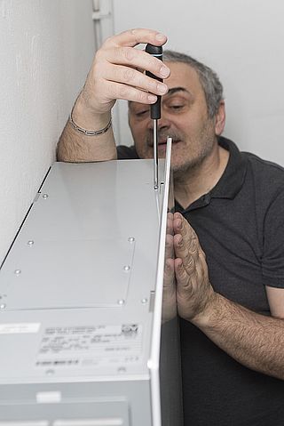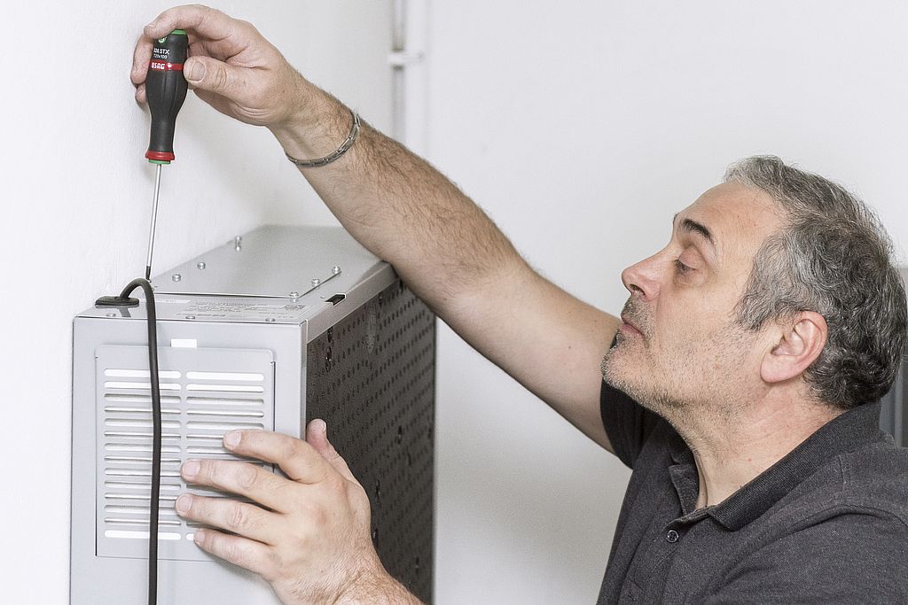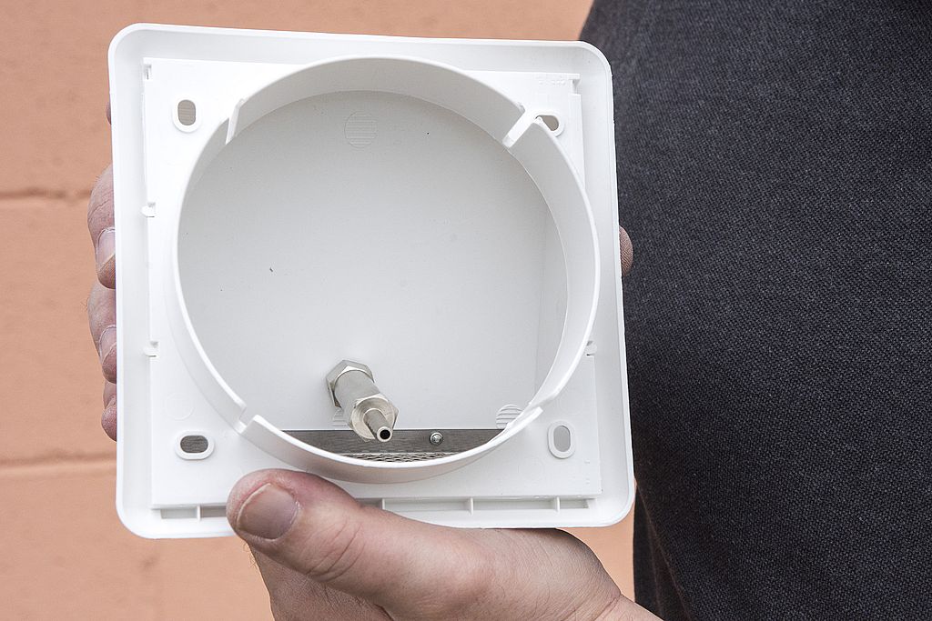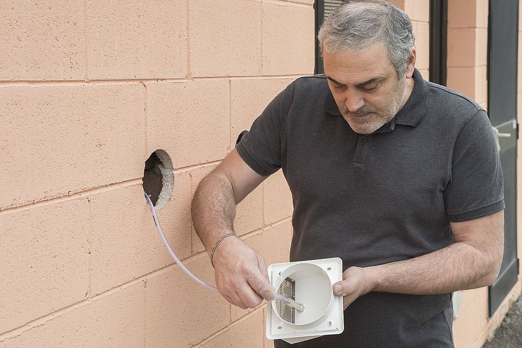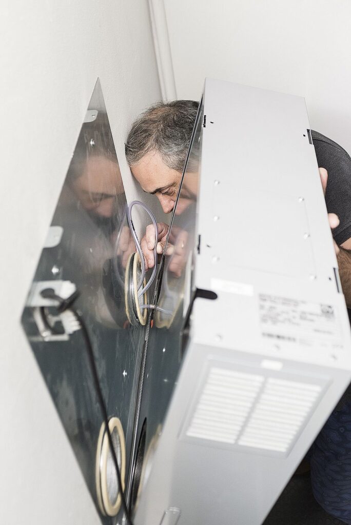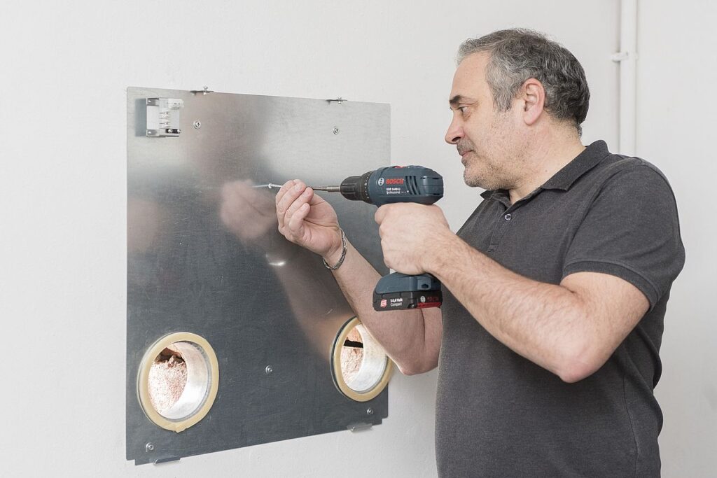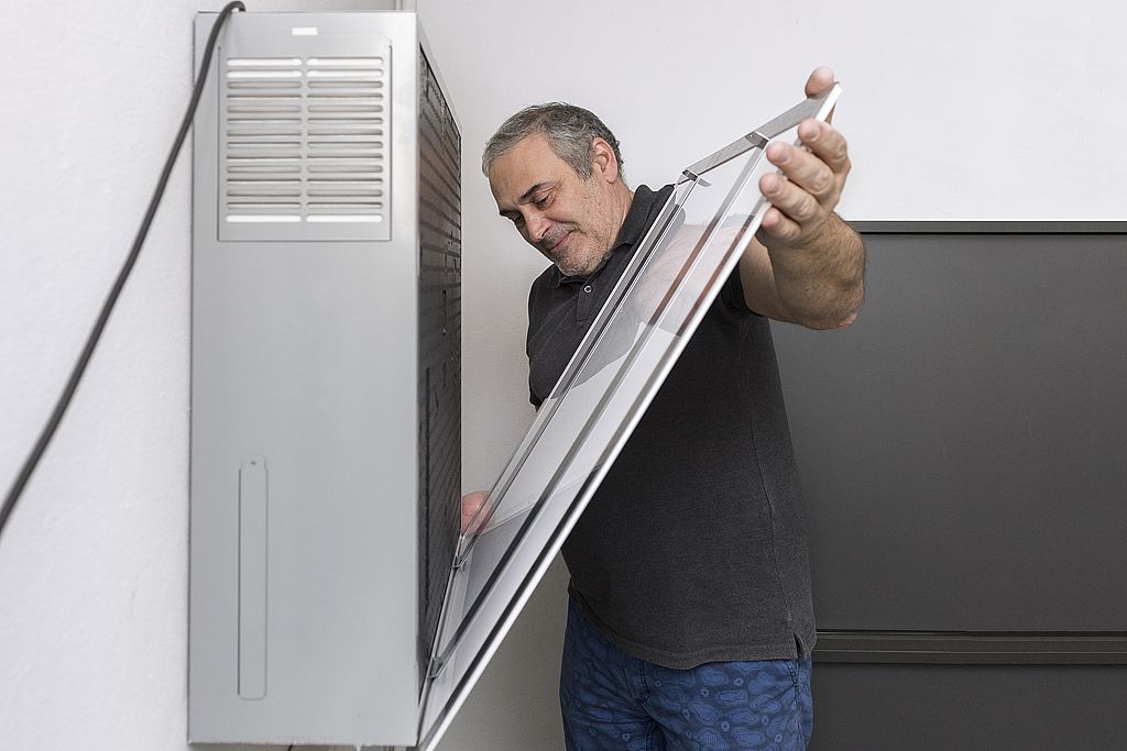 Le bocchette per la presa e l’espulsione dell’aria vanno realizzate con una carotatrice e una fresa da 125 millimetri, mantenendo una lieve pendenza verso l’esterno. Dopo il carotaggio, inserire nei canali un tubo rigido per edilizia in PVC ed eseguire la sigillatura con le necessarie opere murarie. La posa dell’impianto elettrico può essere eseguita con tubo sottotraccia (incassato) oppure a vista, mediante un canale esterno: la struttura della macchina consente l’ingresso dei cavi di alimentazione sia sul posteriore che dall’alto. Aprendo il cassetto del filtro si accede a una presa USB, tramite la quale, seguendo un’apposita procedura riportata sul manuale d’installazione, sarà possibile eseguire eventuali aggiornamenti del software. Tutte le funzioni sono controllabili tramite un pannello comandi touch. La macchina è predisposta per essere gestita da comando remoto a distanza: per questo occorre prevedere un cablaggio specifico».