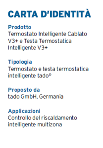Diverse le soluzioni of­ferte da tado° in questo ambito, come il Termostato Intelligente Cablato e la Testa Termostatica Intelligente. Entrambi i prodotti possono essere forniti in un Kit di Base che include un apposito Internet Bridge, che si collega al router e collega tutti i dispositi­vi tado°.