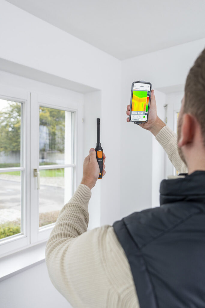La modalità umidità visualizza le zone umide su pareti, soffitti e angoli, permettendo una valutazione semplice del pericolo di formazione di muffa tramite una scala a semaforo (in collegamento al termoigrometro testo 605i).