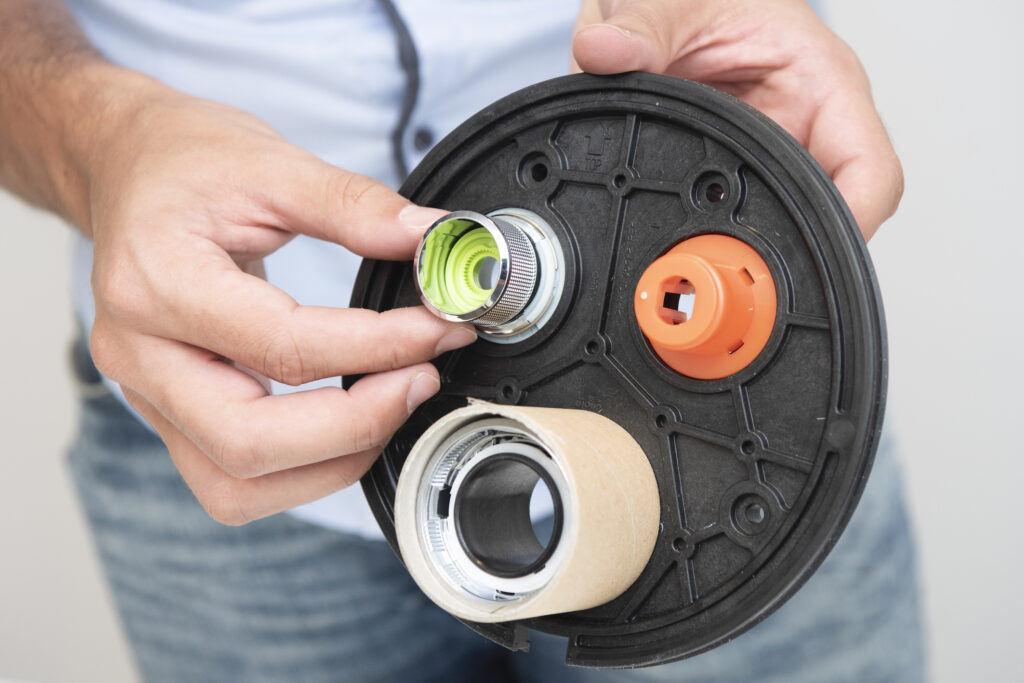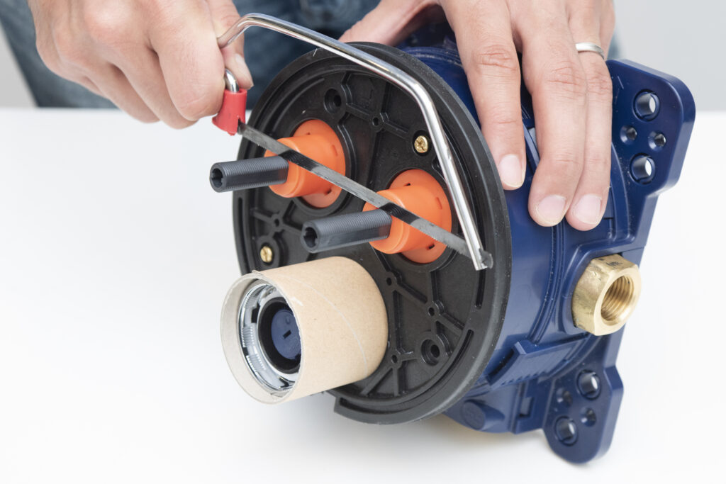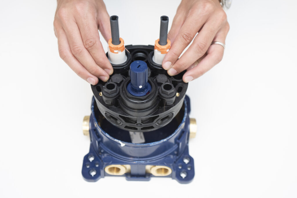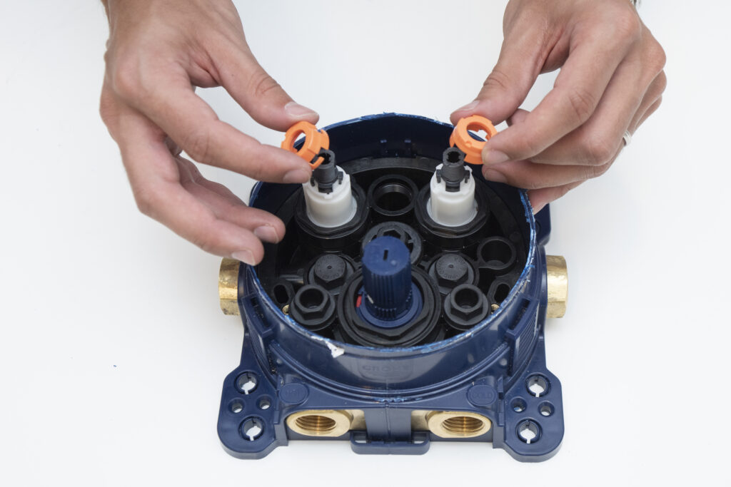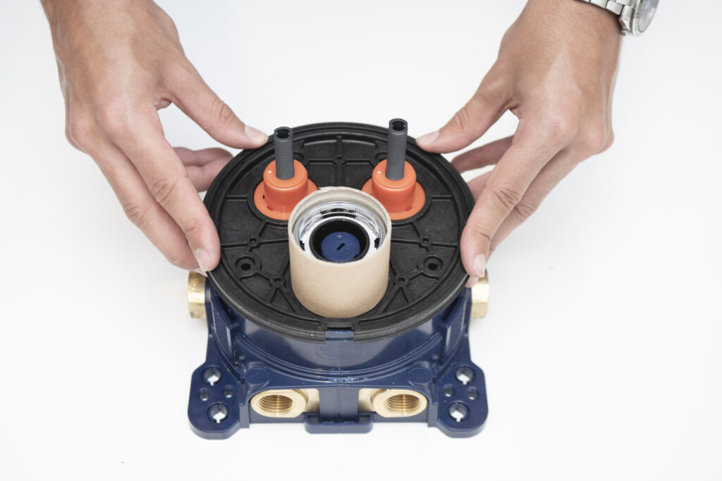 La profondità minima di incasso di Rapido SmartBox, di soli 75 mm, consente l’installazione anche su pareti molto sottili. Le asole presenti nell’unità funzionale permettono di regolare di 6 gradi il corpo principale del miscelatore, per ottenere un allineamento preciso della piastra qualora non risultasse in bolla a causa di errori di muratura. Gli attacchi in ottone semplificano il serraggio delle tubazioni: non occorrono morse, è sufficiente una chiave inglese. Le valvole di chiusura dell’erogazione dell’acqua, disponibili come opzione aggiuntiva e utili in caso di manutenzione, sono facilmente sostituibili. GROHE Rapido SmartBox è configurabile con una protezione anti-reflusso conforme alla norma EU EN1717, per evitare la contaminazione dell’acqua potabile.