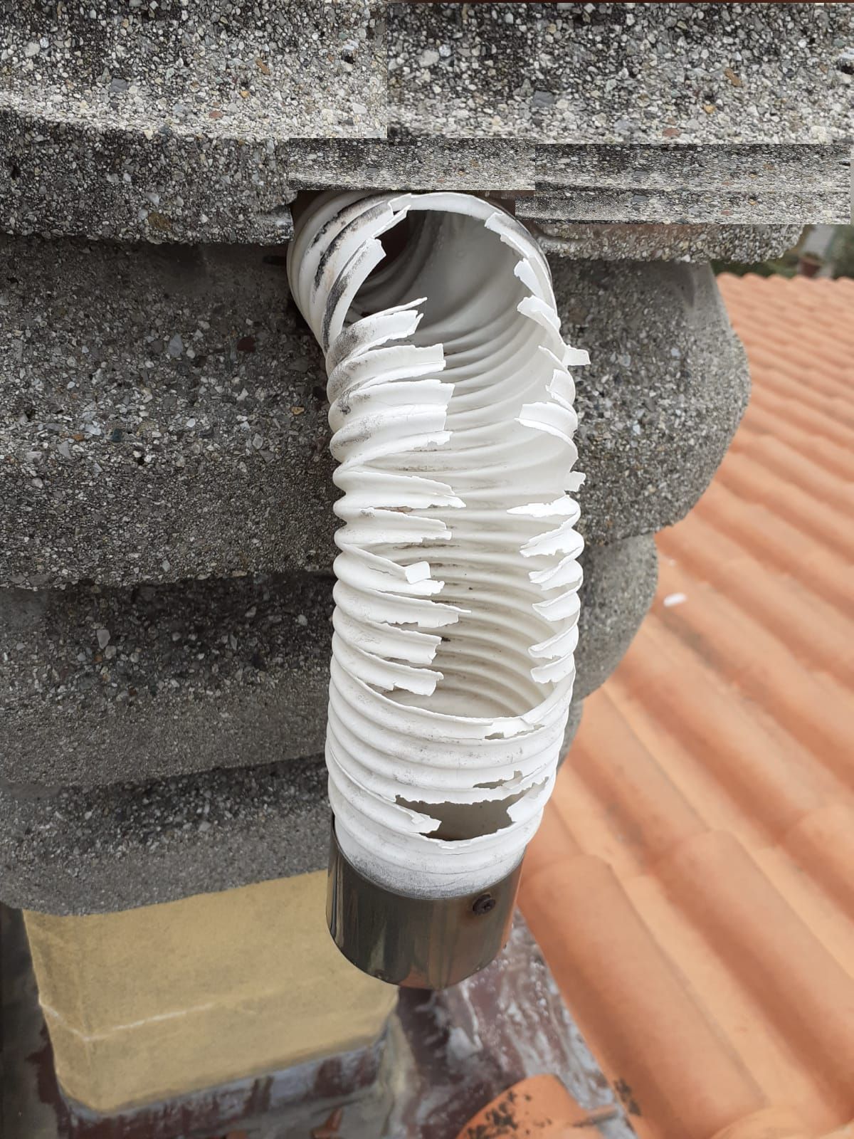 Foto di un terminale per condensazione… Se la plastica PPE non è certificata per uso esterno un motivo ci sarà! Inoltre, a un tubo flessibile sono concessi spostamenti sull’asse fino a 45 °C e qui siamo all’inversione a U! Vogliamo parlare dell’uscita a favore di vento?