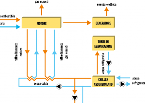 “Cogenerare” significa produrre e consumare contemporaneamente diverse forme di energia secondaria (per esempio meccanica, elettrica o termica) partendo da un’unica fonte all’interno di un unico sistema integrato. Dai sistemi di cogenerazione derivano i più recenti sistemi di “trigenerazione” i quali, nel periodo estivo od ogni qualvolta sia richiesto “il freddo”, oltre a produrre energia elettrica, sono in grado di recuperare il calore e trasformarlo in energia frigorifera grazie all’impiego di un ciclo frigorifero ad assorbimento. Il funzionamento di tale ciclo si basa su trasformazioni di stato del fluido refrigerante (acqua) in combinazione con una sostanza utilizzata quale assorbente (per esempio, bromuro di litio). La “trigenerazione” è in sintesi una particolare tecnica cogenerativa che consente, da una parte, di auto-produrre energia elettrica, dall’altra di utilizzare l’energia termica (recuperata) per produrre energia frigorifera, cioè acqua refrigerata per il condizionamento o per i processi industriali. I principali vantaggi della trigenerazione sono: la riduzione dei costi dell’energia primaria; la maggiore energia elettrica disponibile; l’utilizzo del calore in esubero; la riduzione dei costi di gestione. Rispetto alla generazione di sola energia elettrica, in un sistema di trigenerazione il rendimento globale aumenta considerevolmente perché viene sfruttata una maggiore percentuale del potere calorifico del combustibile, ottenendo risparmi energetici anche nell’ordine del 60%.