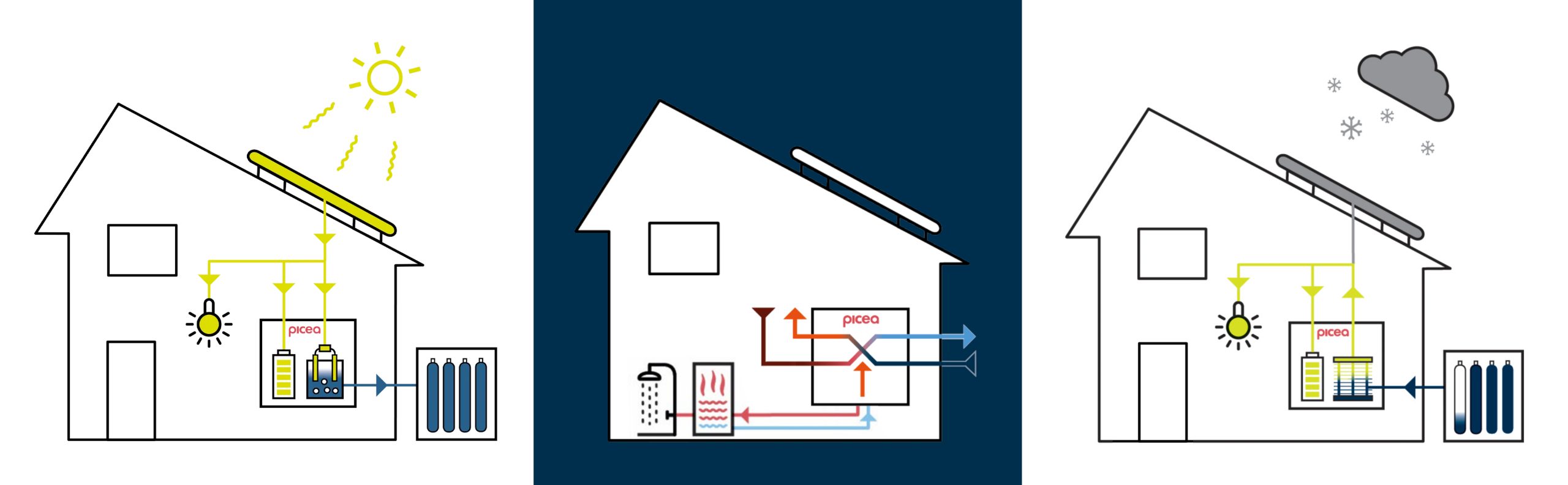 In estate (a sinistra) Picea converte l’elettricità prodotta dall’impianto fotovoltaico per alimentare direttamente l’edificio e per caricare l’accumulo a breve termine. Il surplus di energia solare è inviato all’elettrolizzatore per la produzione dell’idrogeno, immagazzinato nel serbatoio esterno.