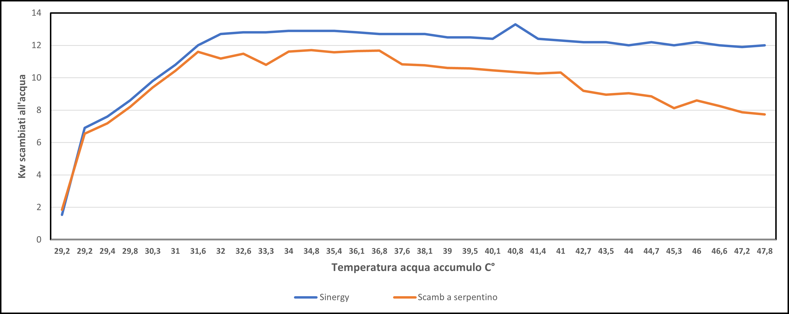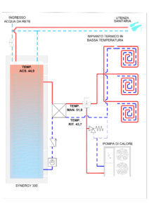 L’idea consiste in un accumulo di acqua tecnica per la produzione istantanea dell’ACS. Quando la temperatura dell’acqua tecnica si avvicina al setpoint (generalmente 50 °C), Sinergy 300 trasferisce tutta l’energia utilizzata dal generatore, utilizzando un semplice scambiatore di calore a piastre.