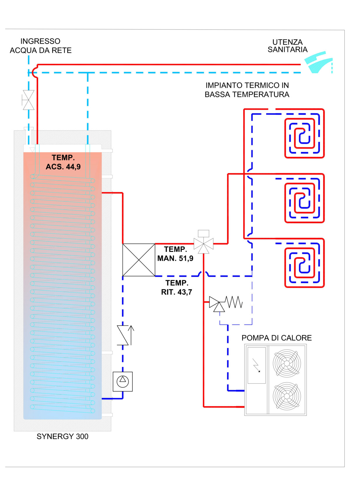 Sinergy 300 opera solo in riscaldamento con acqua tecnica. Lo scambio termico di carico (ΔT = 4÷10 °C) avviene mediante lo scambiatore a piastre all’esterno dell’accumulo. Il prelievo dell’acqua calda sanitaria avviene tramite il serpentino in acciaio inox posto all’interno. Poiché l’ACS è prodotta istantaneamente, non sono necessari trattamenti di addolcimento e anti-legionella ad alta temperatura, per un ulteriore risparmio di energia.