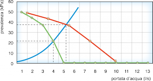 Questa affermazione fondamentalmente è vera, ma nella realtà impiantistica la situazione cambia. In effetti, se ad una pompa ne viene affiancata un’altra perché la sua portata risulta scarsa per il circuito in cui essa è inserita, il complesso costituito dalle due pompe si comporta come una sola pompa “equivalente” la cui curva è diversa da quella delle due pompe (curva in blu del diagramma portata/prevalenza). La curva della pompa equivalente (curva in rosso) si costruisce sommando le portate di ognuna delle due pompe a parità di prevalenza erogata. Tracciando sul diagramma portata/prevalenza la curva caratteristica dell’impianto in cui le pompe sono inserite possiamo vedere la differenza tra i comportamenti della pompa singola e delle due pompe collegate in parallelo. Nel diagramma proposto nella figura, la pompa singola presa in esame se inserita nel circuito considerato trova un punto di funzionamento corrispondente ad una portata di 4 l/s con una prevalenza di 20 kPa. Il complesso costituito dalle due pompe collegate in parallelo trova invece un punto di funzionamento corrispondente ad una prevalenza di 38 kPa ed una portata di 5,4 l/s la quale è ben lungi dall’essere il doppio di quella erogata dalla pompa singola (tutto ciò vale ovviamente anche se le pompe fossero tra loro diverse). Si noti che tale variazione negativa è tanto più accentuata quanto meno è “piatta” la curva della pompa originale e tanto più è “rampante” la curva caratteristica dl circuito (in altre parole quanto più elevata è la resistenza idraulica del circuito).