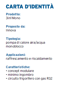 • 3in1 Mono S di INNOVA, ver­sione singola senza serbato­io, contiene la pompa di calo­re aria/acqua (in classe di ef­ficienza A++), per il riscalda­mento, raffreddamento e la produzione di acqua calda sa­nitaria, un compressore twin rotary DC inverter e il ventila­tore modulante a garanzia del massimo comfort, di un mi­nimo consumo elettrico e di un’ottima silenziosità.