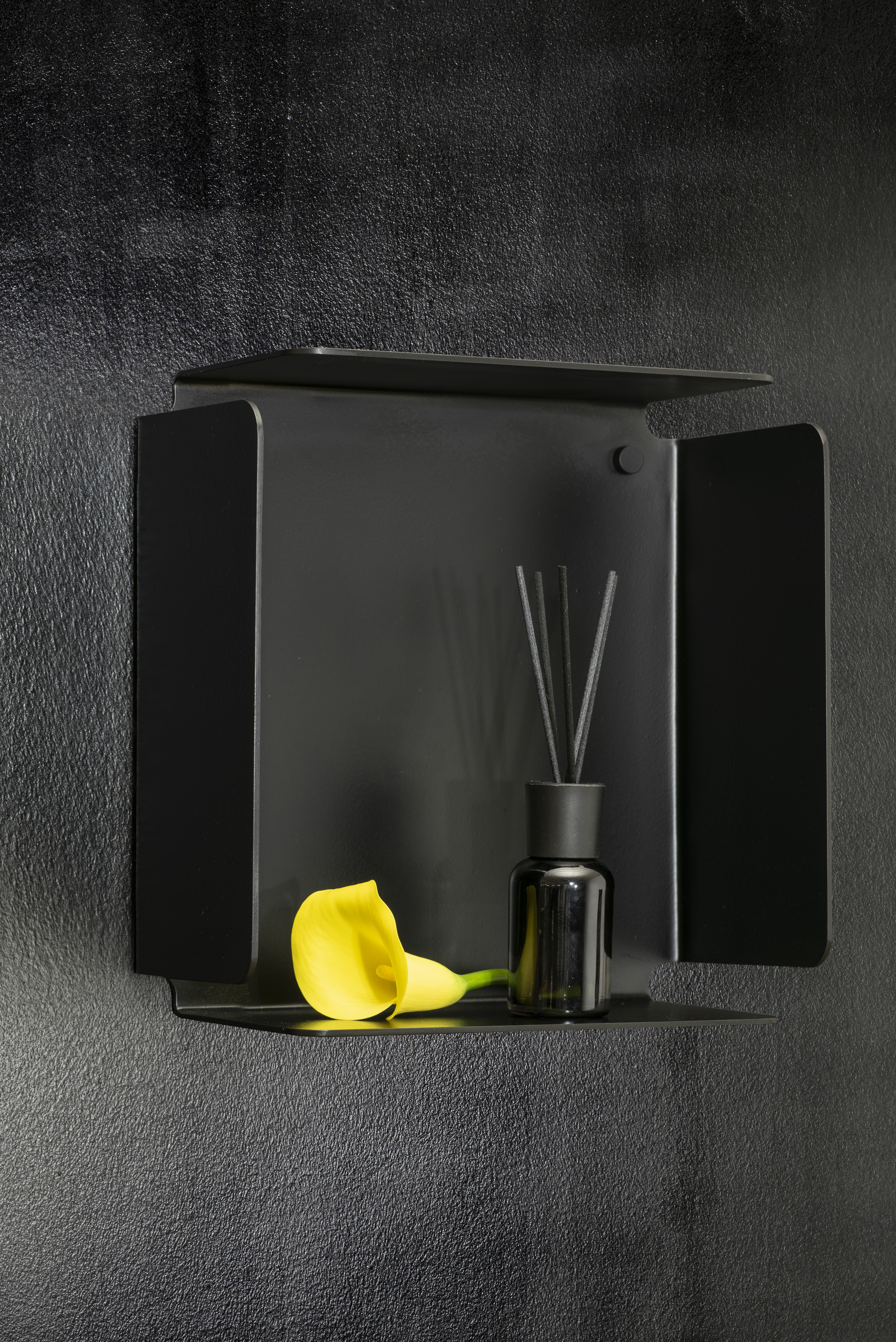 Tutto è stato realizzato tagliando e piegando una lastra di metallo, mentre i fissaggi e gli incastri sono stati volutamente lasciati a vista. Lo specchio, con un perno posto nella parte alta, viene appeso in stile quadro. Le mensole attraverso spazi sagomati possono alloggiare accessori come il bicchiere porta spazzolino o il dispenser del sapone.