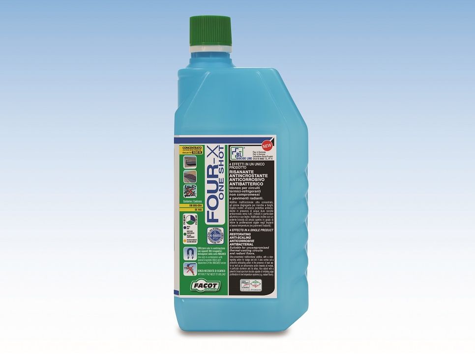 additivoFour-X One Shot è un additivo multifunzionale super concentrato, ad azione disgregante per morchie e fanghi agendo all’interno del circuito senza necessità di scarico o risciacquo finale. Presentato da Facot Chemicals (Capralba, CR), esplica inoltre un’azione protettiva antincrostante in presenza di acque dure nonché anticorrosiva verso tutti i metalli costituenti gli impianti in particolare verso l’alluminio e le sue leghe.