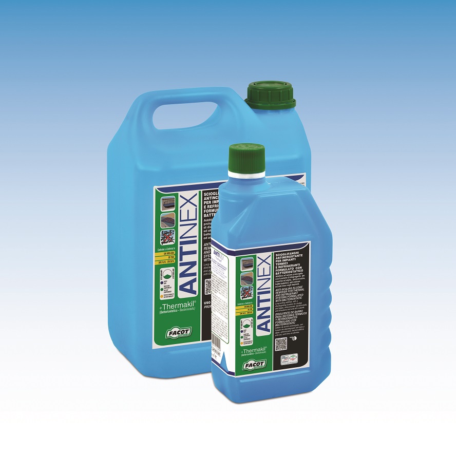 Facot Chemicals (Capralba, CR) presenta ANTINEX+Thermakil, additivo sciogli fanghi risanante, disgregante per morchie, fanghi e calcare negli impianti termici e refrigeranti. Prodotto anticorrosivo adatto a tutti i tipi di impianto di climatizzazione estiva ed invernale sia multi-metallici che di materiale plastico.