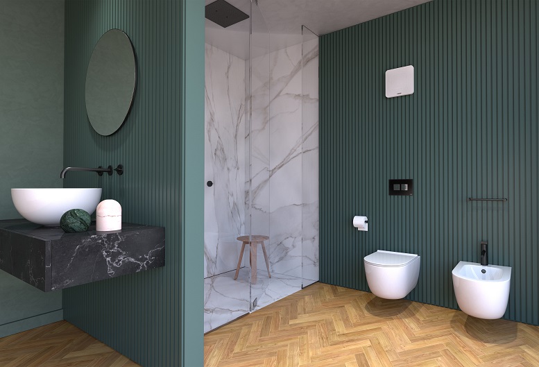 Ariapur si integra perfettamente in ogni bagno: la placca è verniciabile e si sposa facilmente con qualsiasi parete (o soffitto, visto che può essere installato anche in posizione orizzontale).