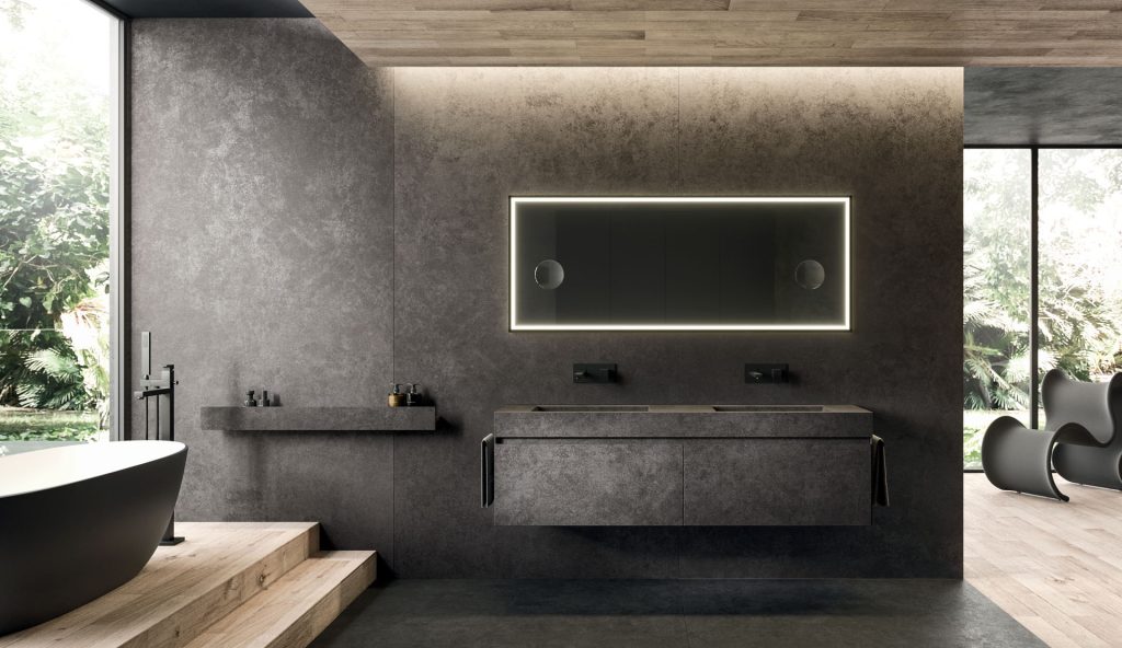 • Perfetto per ambienti eleganti e contemporanei, grazie a un esclusivo design dei lavabi in pietra e marmo naturale (con la caratteristica smussatura a 30 gradi) utilizzabile anche per i monoliti, sempre con illuminazione integrata.