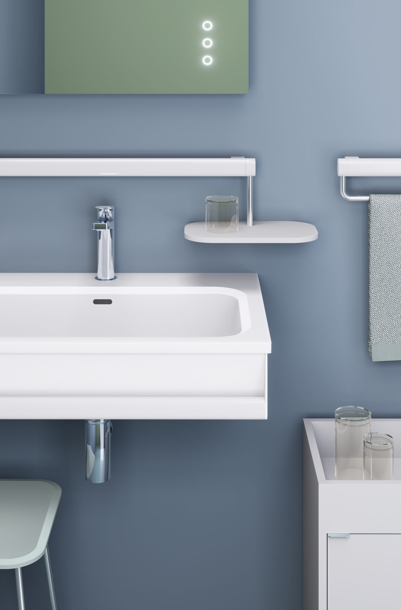 Una collezione, che partendo dalle maniglie di sicurezza, core business della Ponte Giulio, si completa con sedute doccia, mobili contenitori, lavabi, sanitari, specchi, presenta una sua visione intera di ambiente, non lasciando nulla al caso, permettendosi anche di introdurre qualche “chicca” tecnologica.