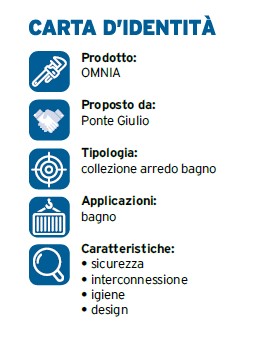Nata dalla collaborazione tra l’ufficio tecnico interno e il designer Daniele Trebbi, OMNIA non segna una rottura con il passato di Ponte Giulio, bensì un’evoluzione; la collezione ha diversi plus tali da renderla particolarmente innovativa. Iniziando dalla partnership con Olympia Ceramica, dando vita ad un rapporto di condivisione di expertise e know how che hanno permesso di immaginare un bagno completo.