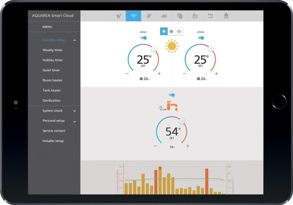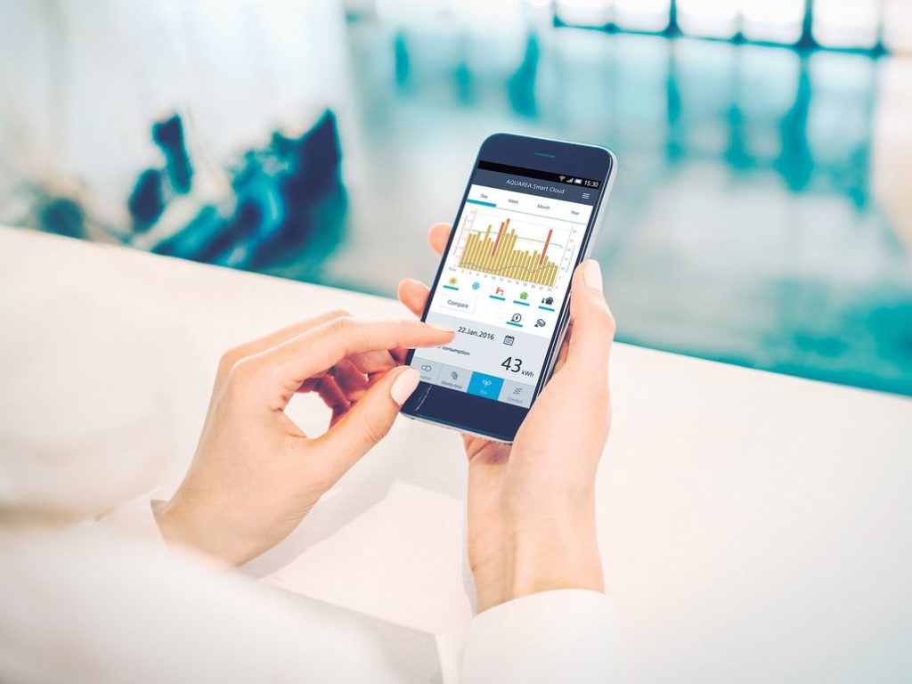 La piattaforma Aquarea Smart Cloud permette pienamente, sia il controllo sia la supervisione dell’impianto di condizionamento. Sono possibili, anche in modo programmabile, l’accensione e lo spegnimento dell’unità, l’impostazione della temperatura ambiente e di produzione dell’acqua calda sanitaria. Inoltre, è consentito tenere sotto controllo i malfunzionamenti e avere visione, su diverse basi temporali, dei consumi energetici.