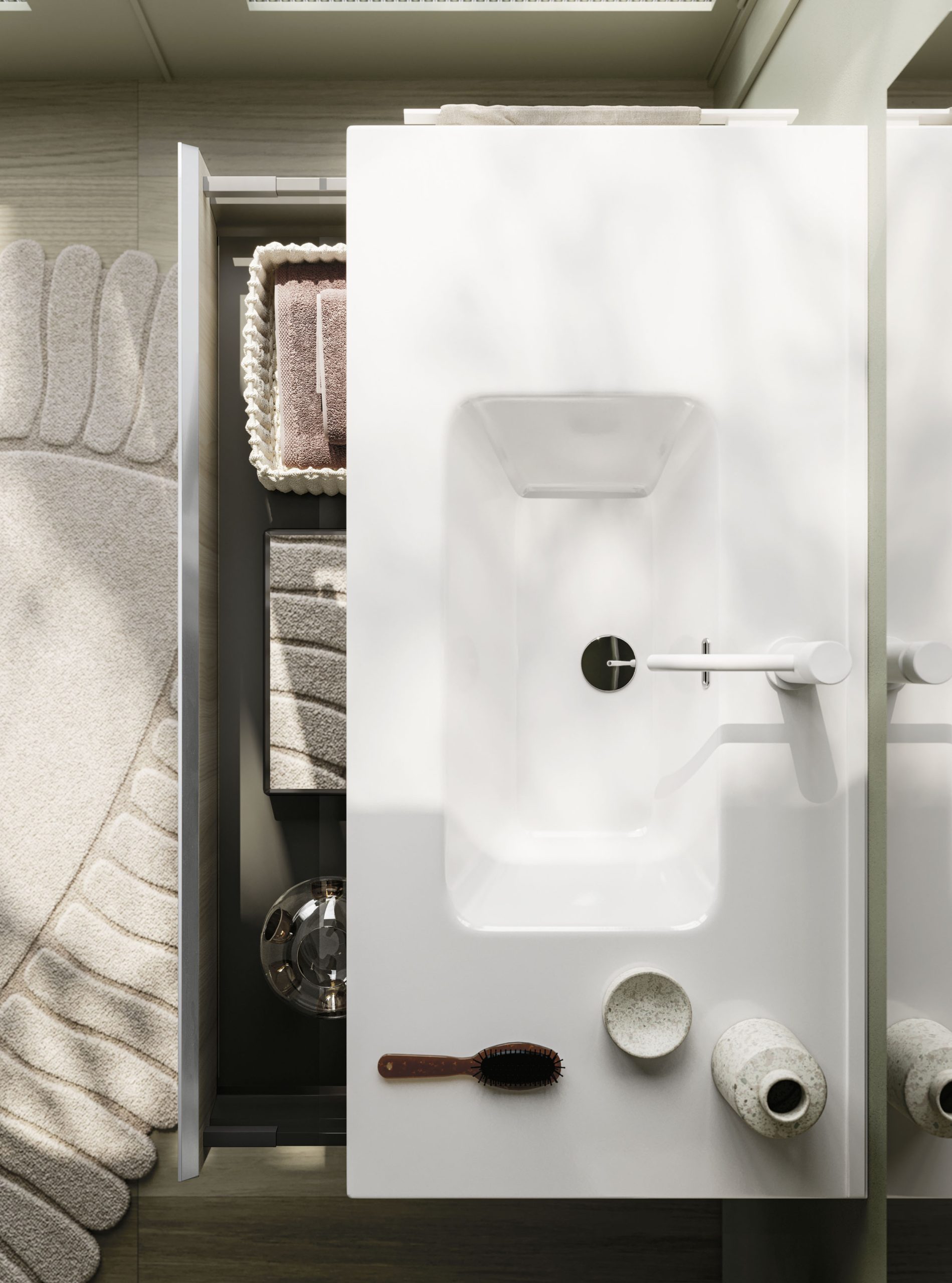 Arbi Arredobagno (Maron di Brugnera, PN) arricchisce la collezione Ho.me Plus con la variante Ho.me Plus 45, che coniuga la linearità delle forme e la massima funzionalità.