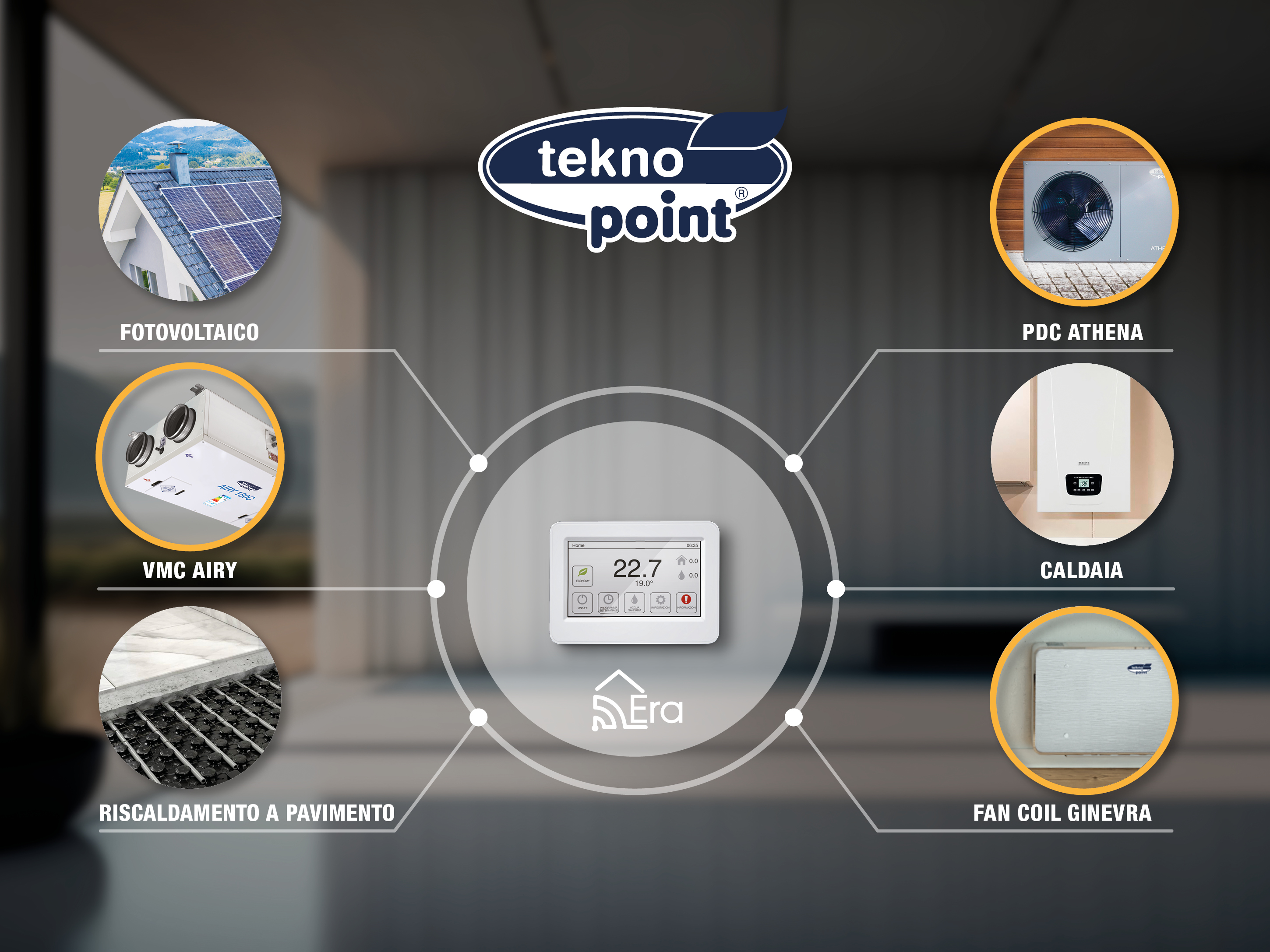 Era è un sistema smart e user friendly, che permette di mantenere sempre sotto controllo l’impianto, garantendo al contempo elevato il comfort abitativo e ottenendo inoltre un risparmio energetico. Era permette di controllare in modo semplice fino a 48 zone diverse, attraverso la centralina di controllo dedicata e agli appositi sensori ubicati nei diversi locali della casa. Modulando l’attività degli impianti domestici si ottiene il clima perfetto, e allo stesso tempo si beneficia di una sostanziale riduzione dei consumi, attraverso l’ottimizzazione del funzionamento dell’interazione dei diversi dispositivi/impianti di riscaldamento/raffrescamento preposti al benessere climatico dell’abitazione. Integrare Era con la pompa di calore Athena permette inoltre di beneficiare pienamente dei bonus fiscali più alti.