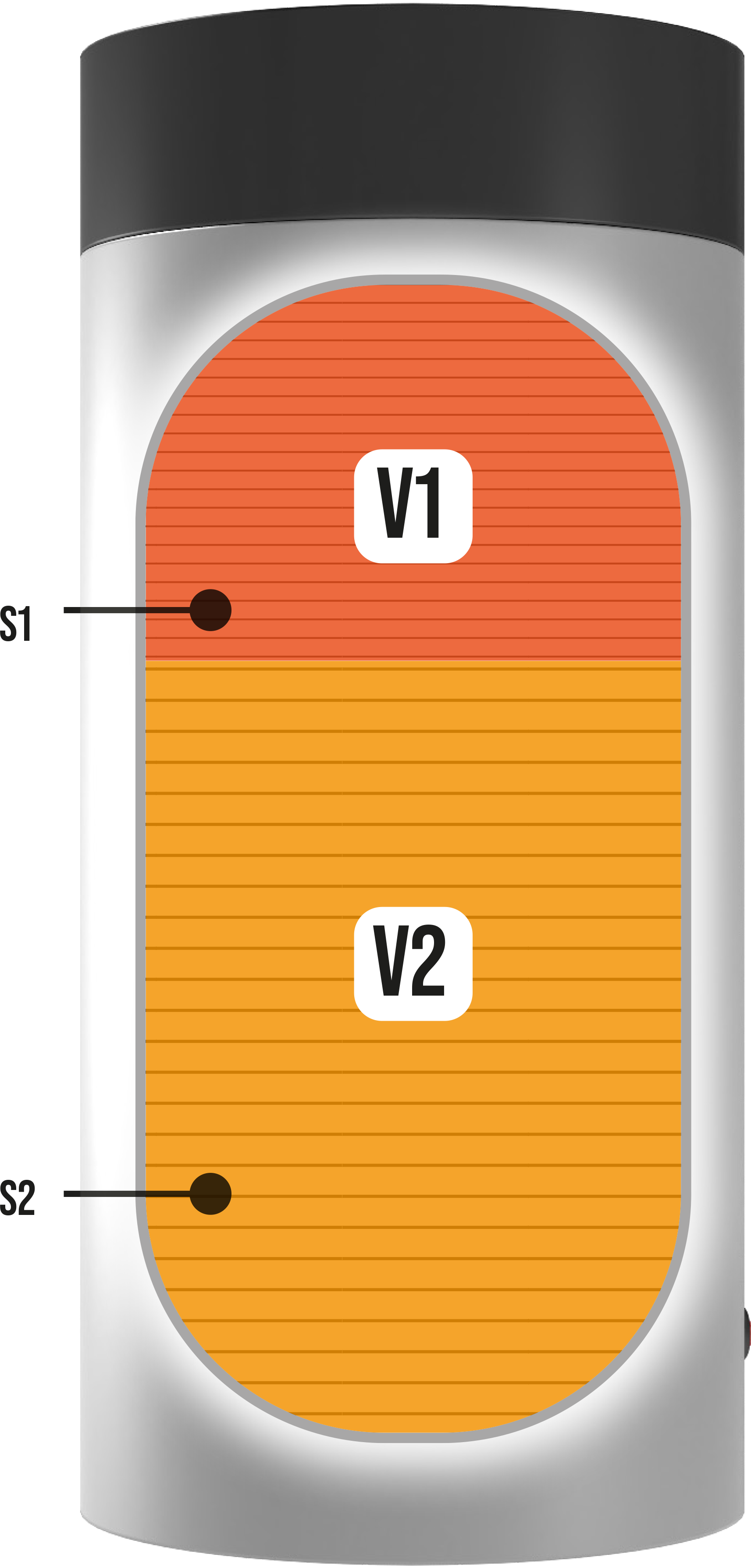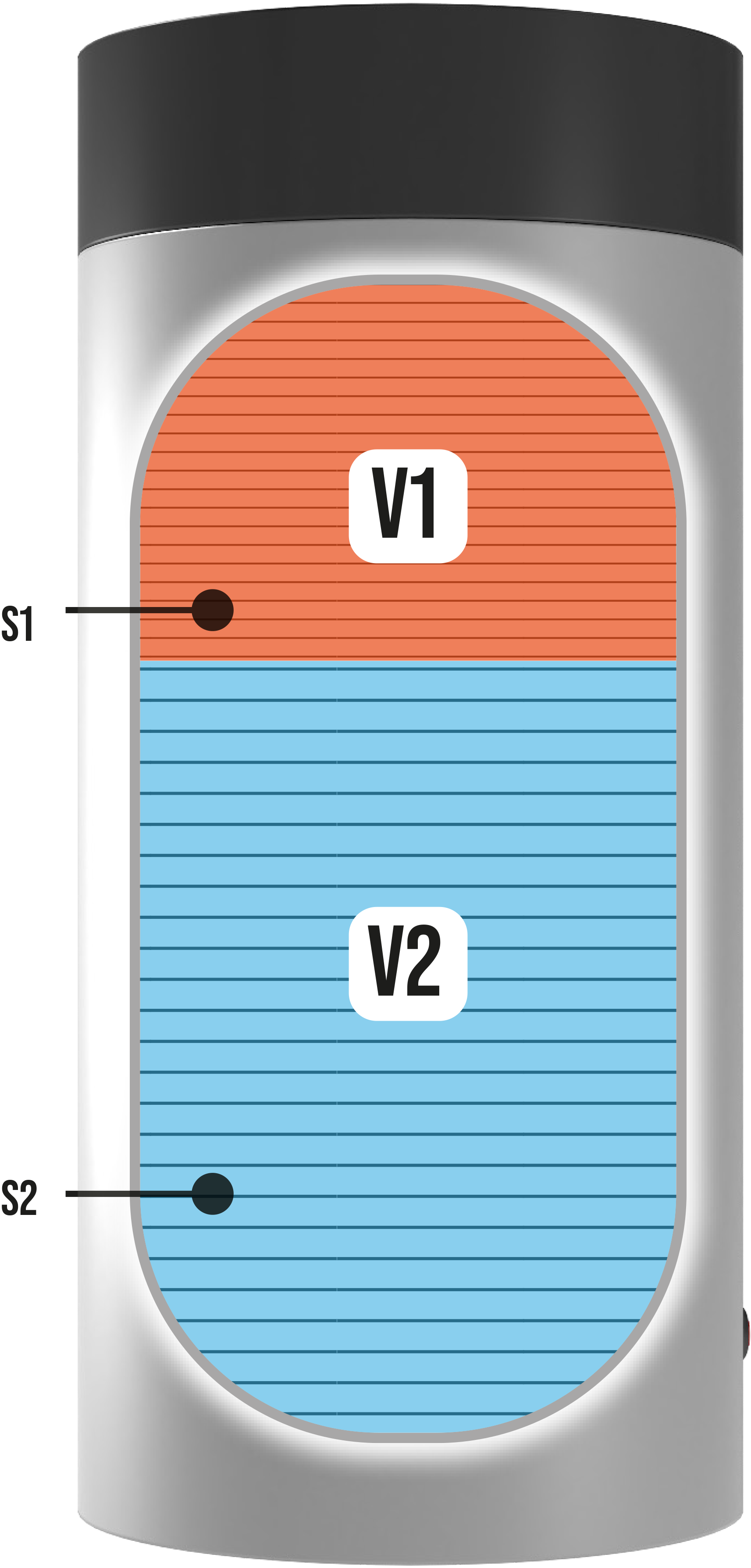 Perfetta stratificazione termica: riscaldamento della sola bassa V2 (al di sotto di S1).