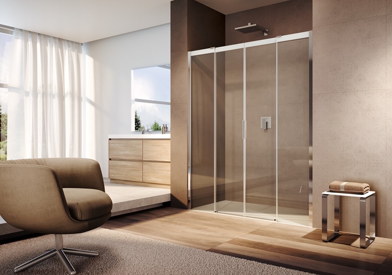 Lo stile minimal è enfatizzato dal vetro temperato di sicurezza: 8 mm per le porte scorrevoli e 6 mm per fissi e laterali, tutti in finitura trasparente. Mentre i profili in alluminio brillante lucido aggiungono un tocco moderno e luminoso.