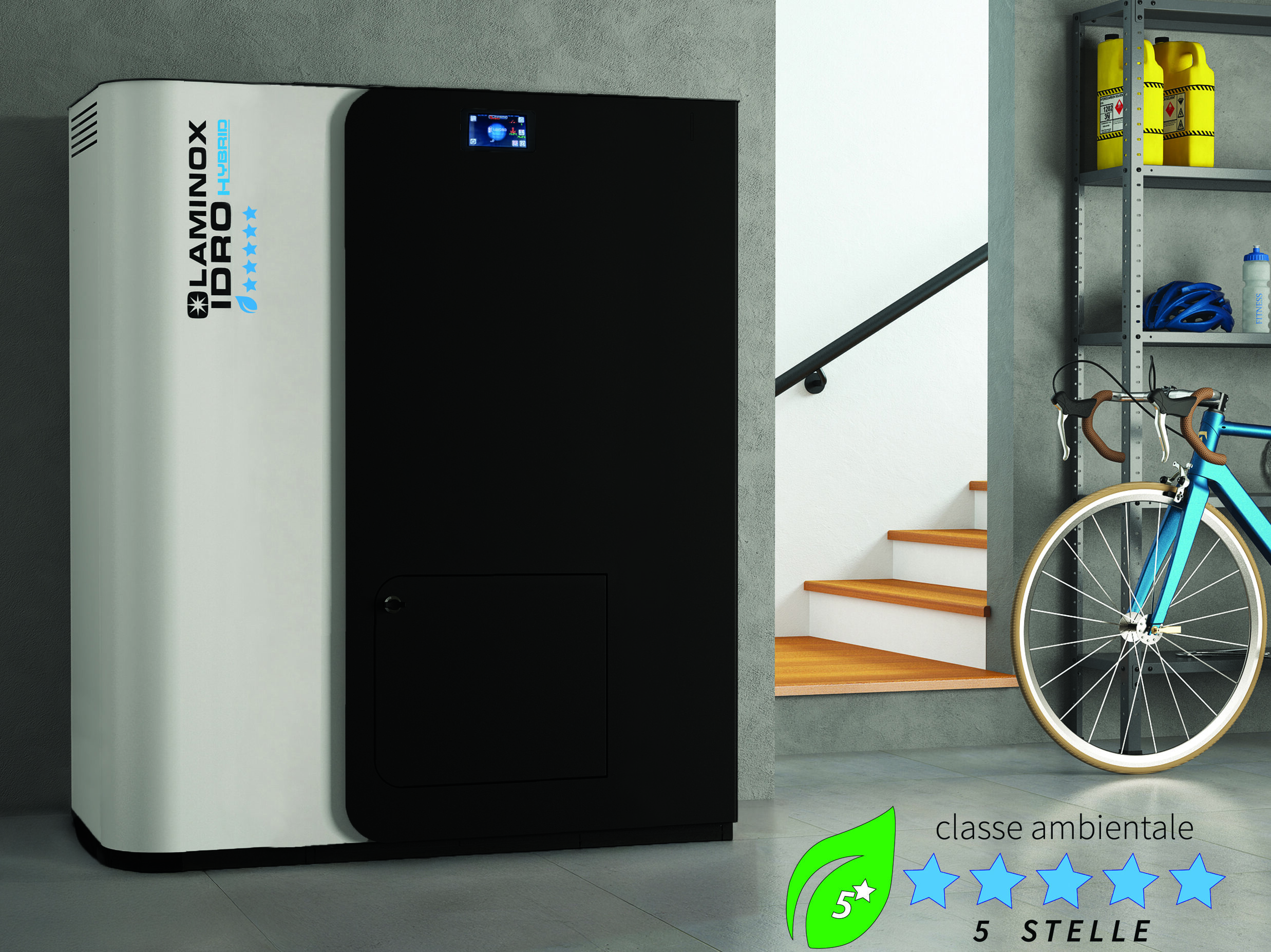 Il Termoboiler HYBRID di Laminox deriva dalla linea di caldaie a pellet Termoboiler standard 15,19,24 e 29 kW con volano termico (100lt) a cui sono stati aggiunti un bollitore di acqua sanitaria (120lt) e un kit idronico per essere abbinato ad una pompa di calore. Il prodotto nasce per combinare il lavoro della pompa di calore con quello della caldaia a pellet, il tutto progettato in modo da ottimizzare le potenzialità delle due fonti di energia. Le modalità di lavoro sono: