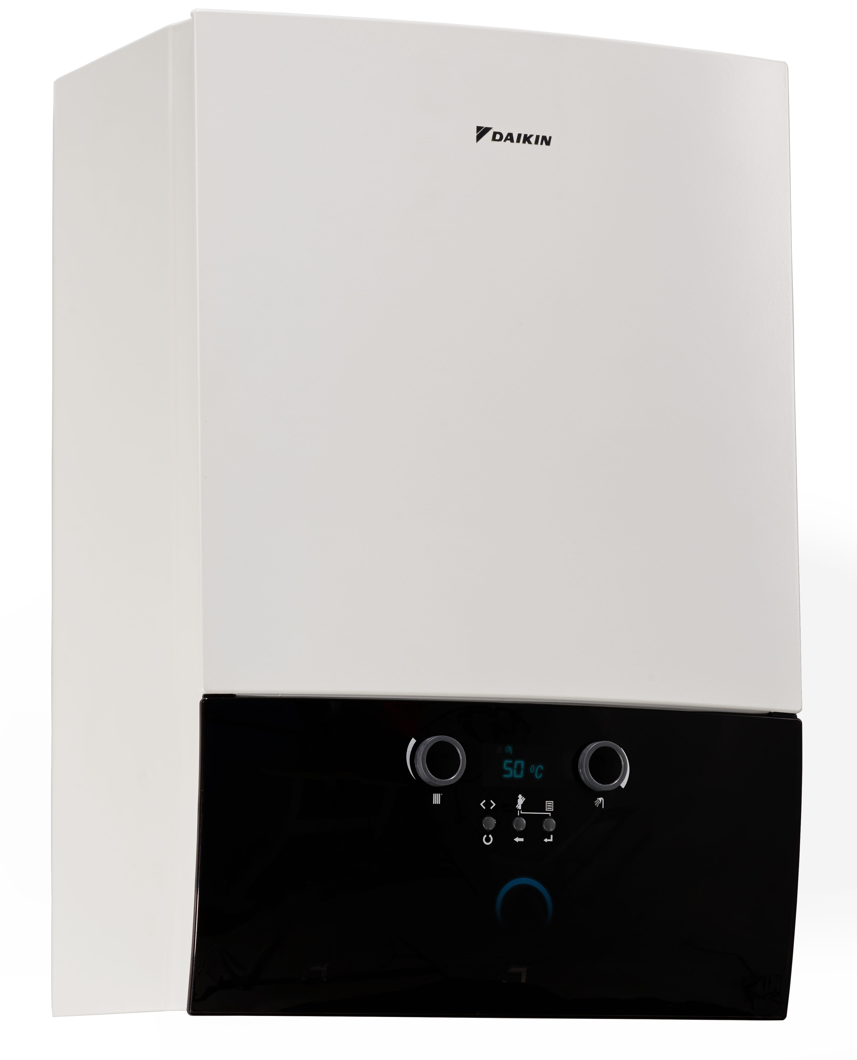 Elemento distintivo del design 100% Daikin è infine il Daikin Eye: un elegante occhio luminoso che grazie ad un led multi cromatico segnala lo stato di funzionamento dell’apparecchio. La luce blu lampeggiante indica quando la caldaia è in standby, mentre resta fissa quando è in funzione. Nel caso di malfunzionamento, la luce diventa rossa e sull’ampio display viene visualizzato il relativo codice di errore così da facilitare l’intervento di riparazione.