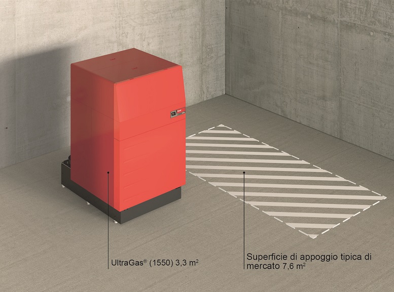Grazie alla sua particolare struttura, la nuova UltraGas® da 1550 kW occupa meno della metà dello spazio, rispetto ai comuni sistemi disponibili sul mercato. Il design verticale, con gli scambiatori di calore montati in posizione verticale, riduce sensibilmente l’ingombro. Inoltre l’intero concetto costruttivo della caldaia consente di risparmiare ulteriore spazio e semplifica l’installazione idraulica. Con una larghezza di soli 1.550 mm, una profondità di 2.152 mm e un’altezza 2.547 mm, UltraGas® (1550) può essere trasportata e installata con la massima semplicità anche in ambienti ridotti. Lo spazio che si risparmia può essere utilizzato per ospitare altri impianti tecnici o come riserva per successivi ampliamenti.