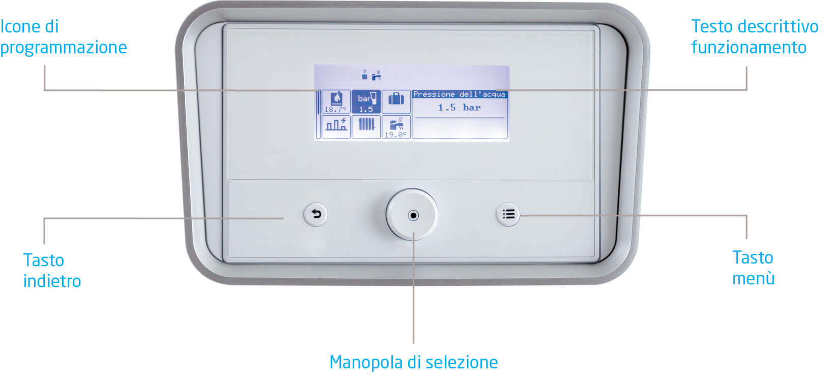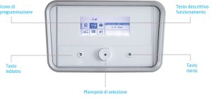 L’elegante pannello di controllo retroilluminato consente la programmazione e la gestione di tutto il sistema con estrema facilità grazie alle icone per la visualizzazione dei parametri, al testo descrittivo, alla manopola di regolazione e ai tasti di selezione menu. Attraverso il dispositivo Power set – i cui parametri sono regolabili dal pannello di controllo – la portata termica della caldaia si regola a seconda del fabbisogno energetico.