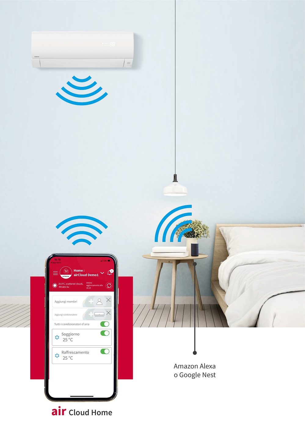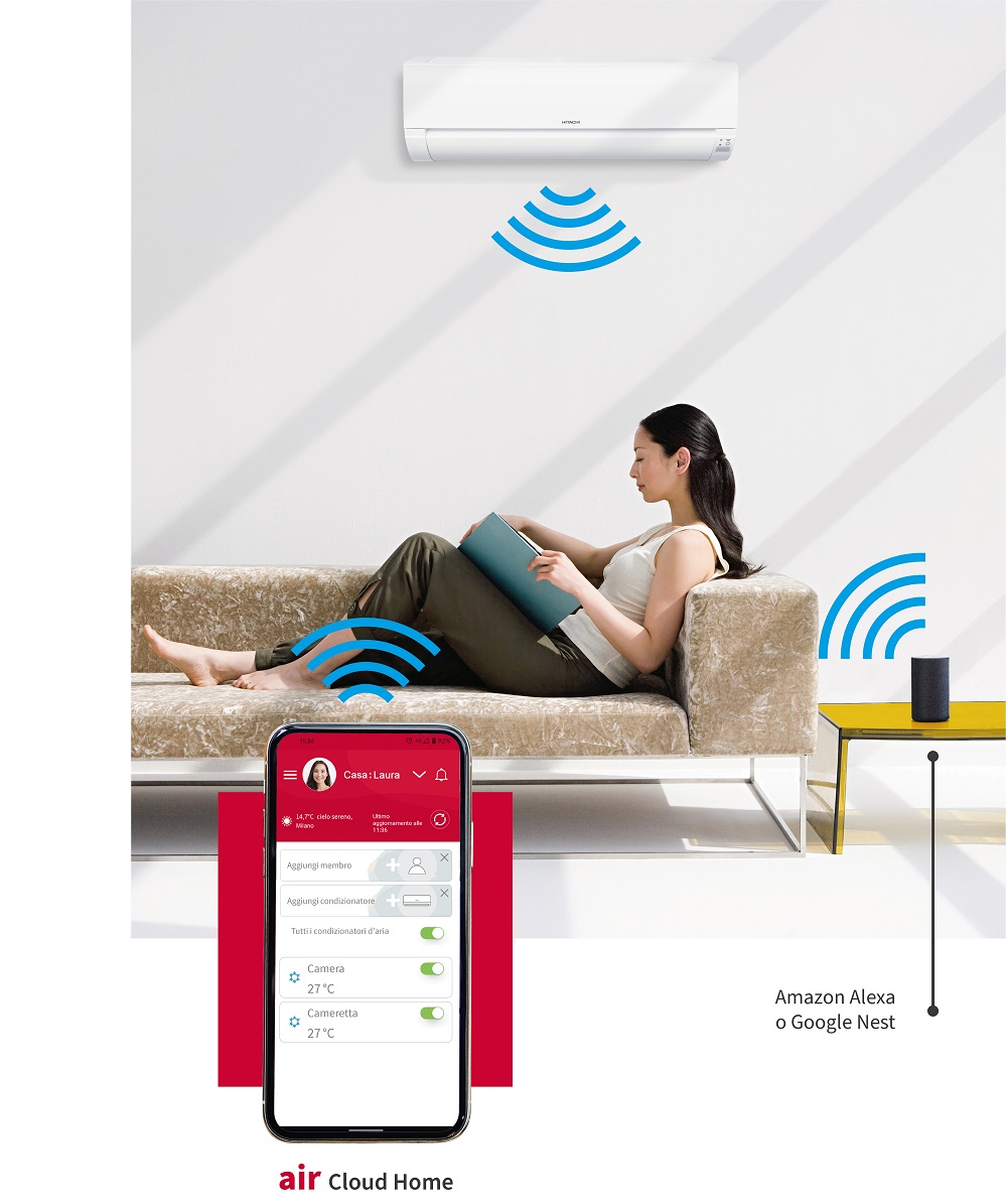 La nuova app airCloud Home, gratuita e scaricabile da Apple Store e Google Play, garantisce la connessione con tutti i dispositivi mobili e la gestione intelligente del climatizzatore Hitachi attraverso il controllo vocale di Alexa e Google Home. L’innovativa funzione di geolocalizzazione Smart Geo Fence, esclusiva Hitachi, rileva la presenza dell’utente nel raggio di 500 metri in uscita e di 10 km in entrata, regolando in automatico accensione, spegnimento e temperatura del climatizzatore in funzione di abitudini e stile di vita, per un comfort elevato e per il massimo risparmio energetico.